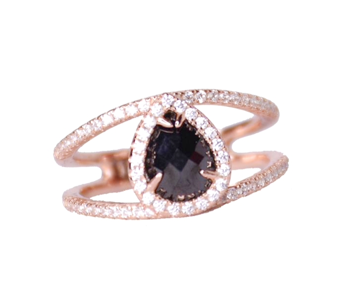 טבעת אבן אוניקס טיפה מרכזית, מכסף טהור 925, ציפוי רוז גולד, משובצת זרקונים.