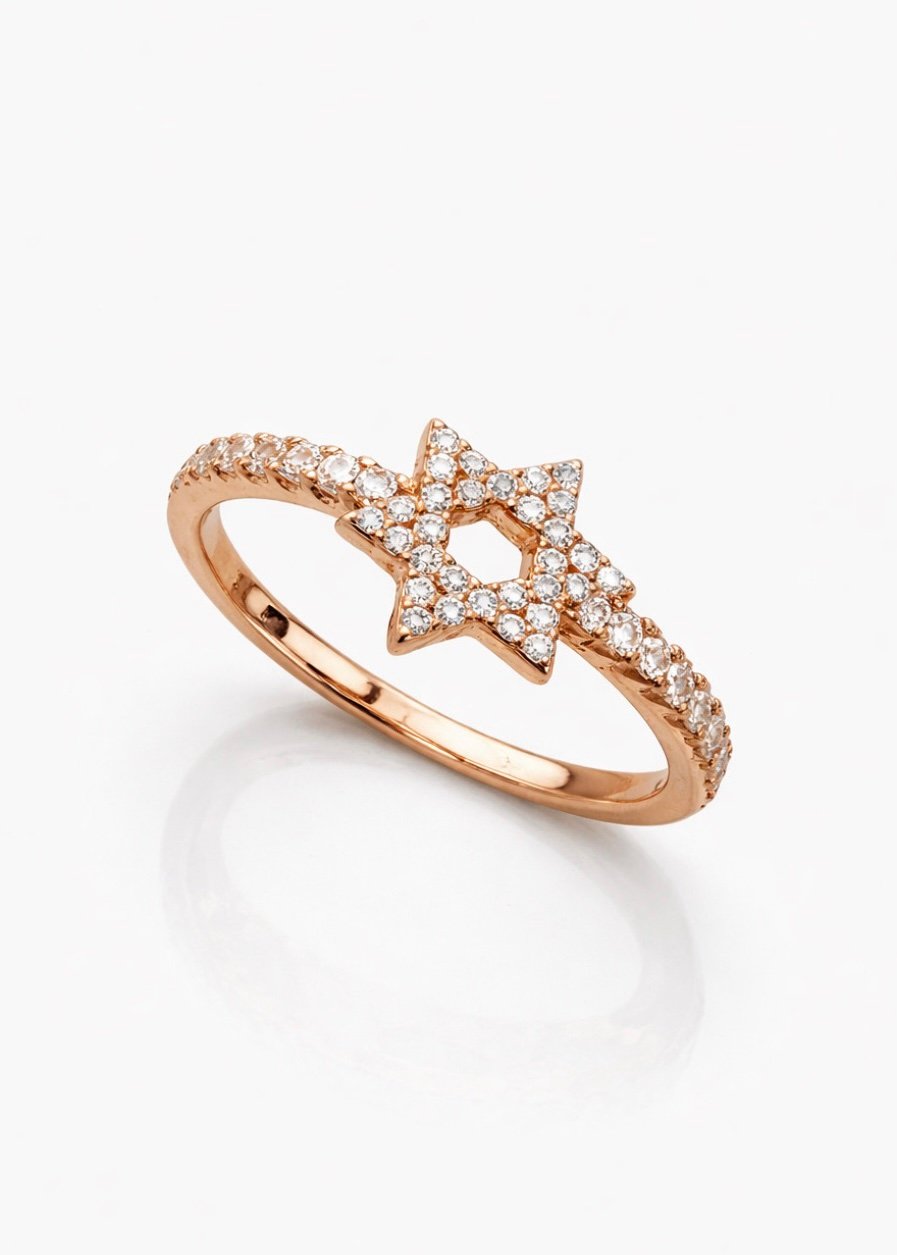 טבעת מגן דוד משובצת מכסף טהור 925/ ציפוי רוז גולד, משובצת זרקונים