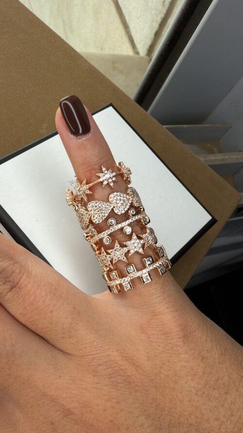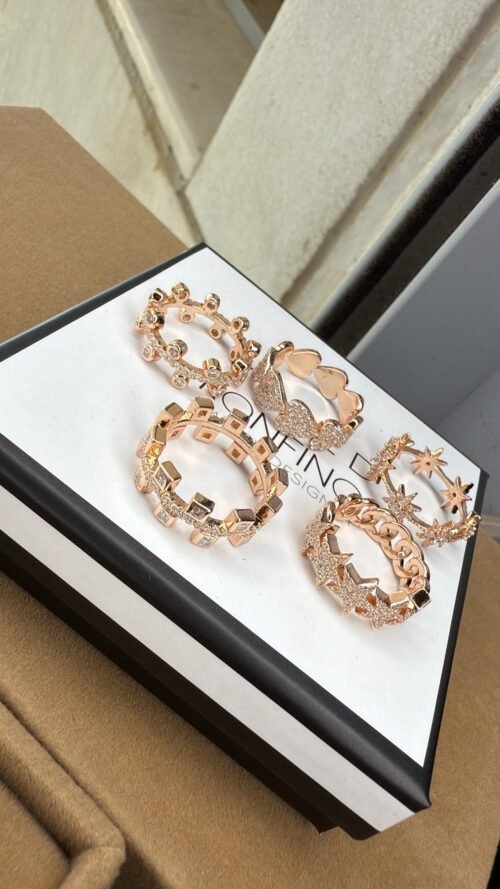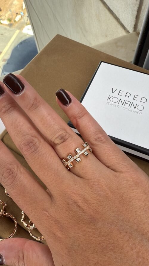 טבעת פס עם ריבועים מכסף טהור 925/ ציפוי רוז גולד, משובצת זרקונים.