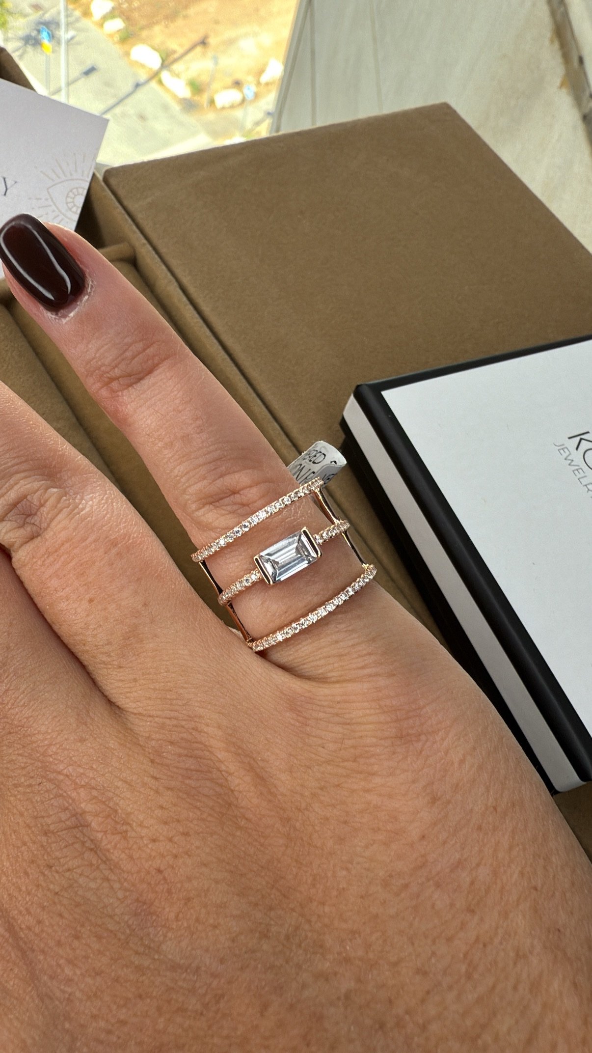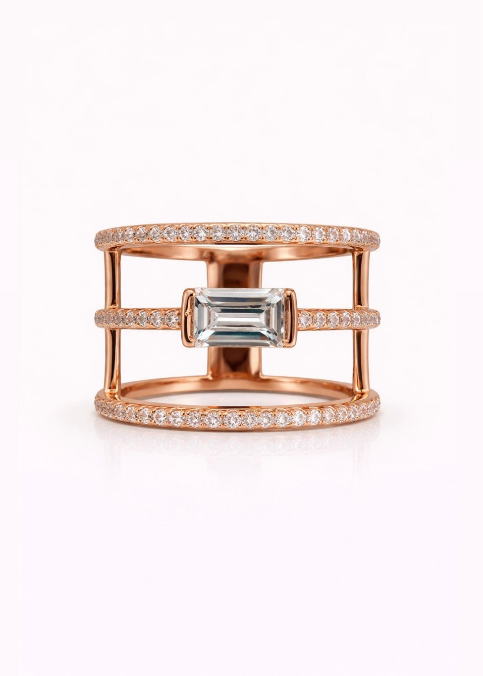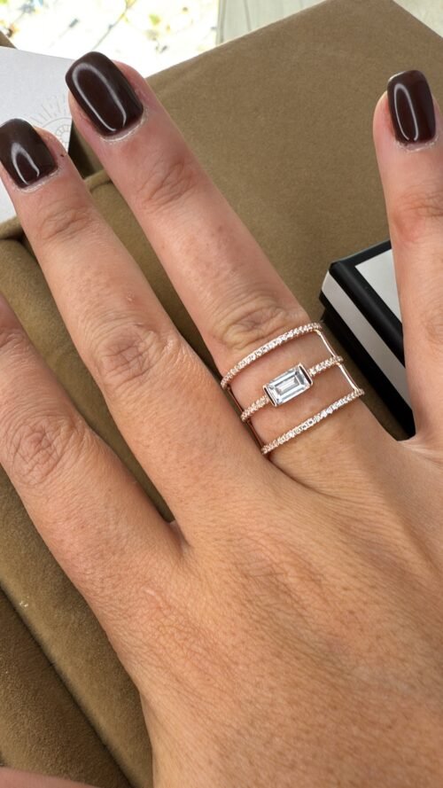 טבעת 3 פסים עם אבן באגט מכסף טהור 925 , בציפוי רוז גולד. משובצת זרקונים.