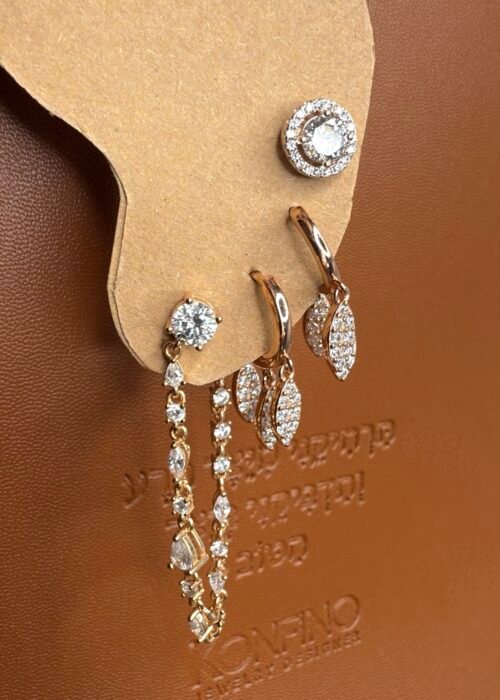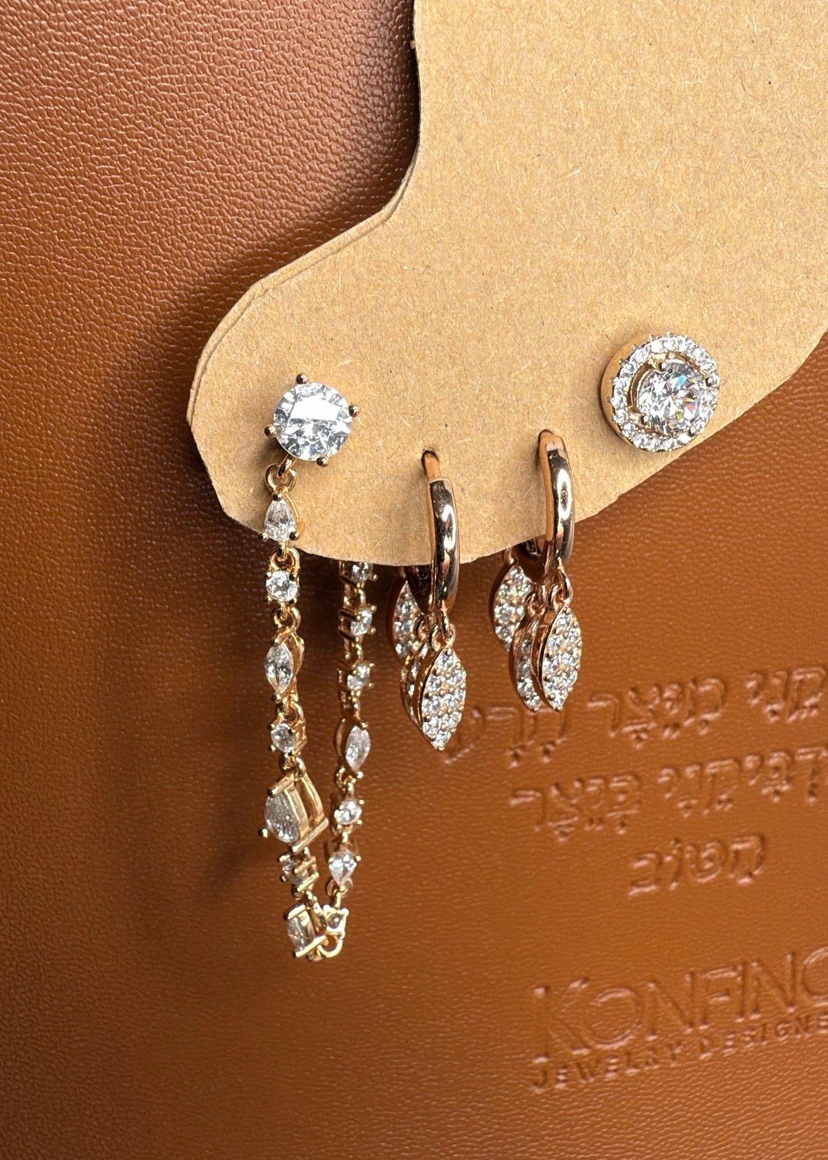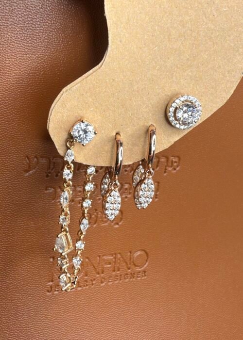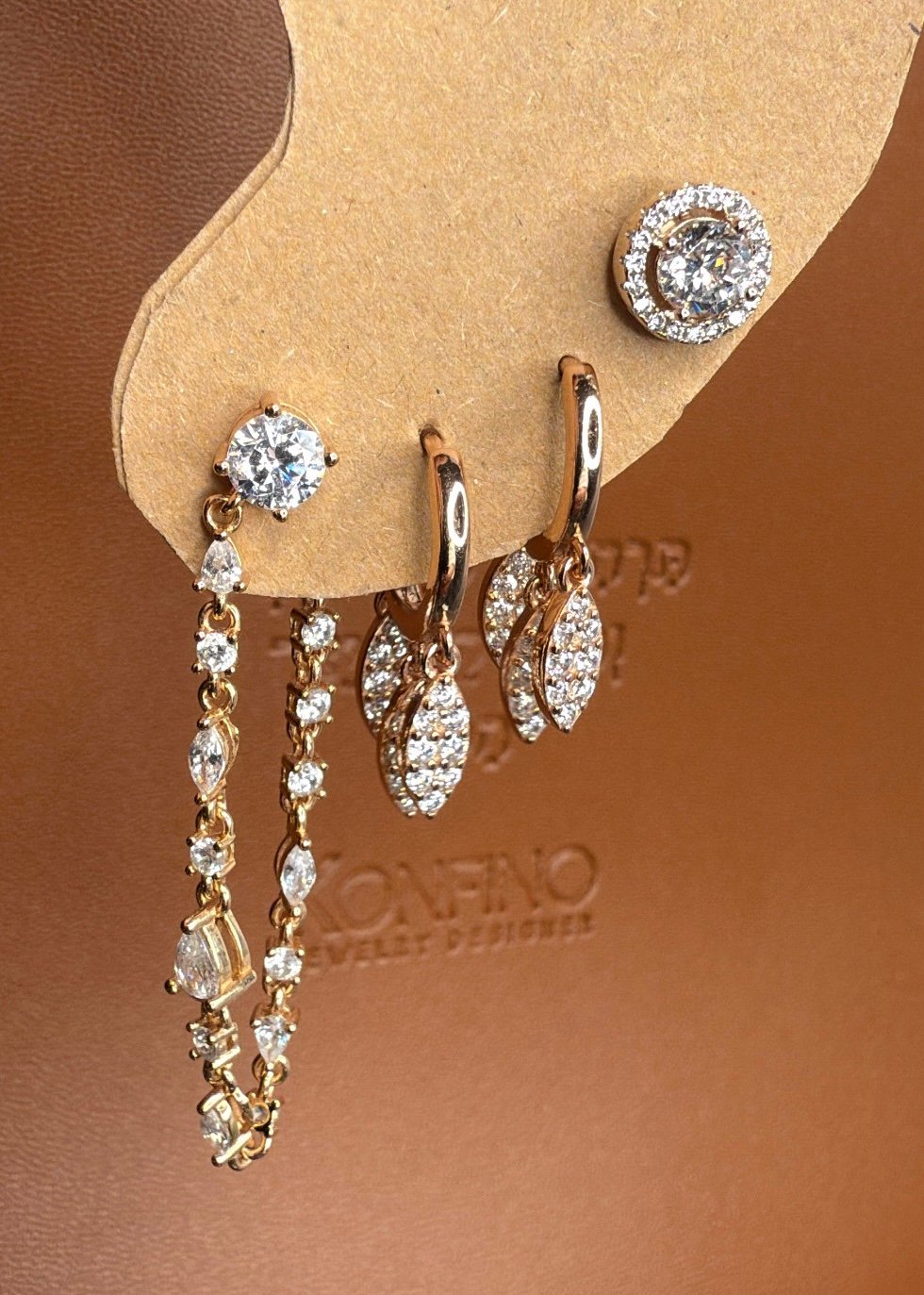 זוג עגילי חישוק מעויינים משובצים, עגיל זרקונים נופל, עגיל זרקון צמוד. סהכ 4 עגילים.