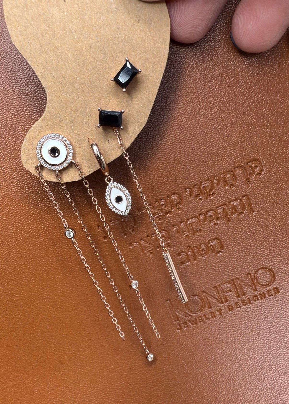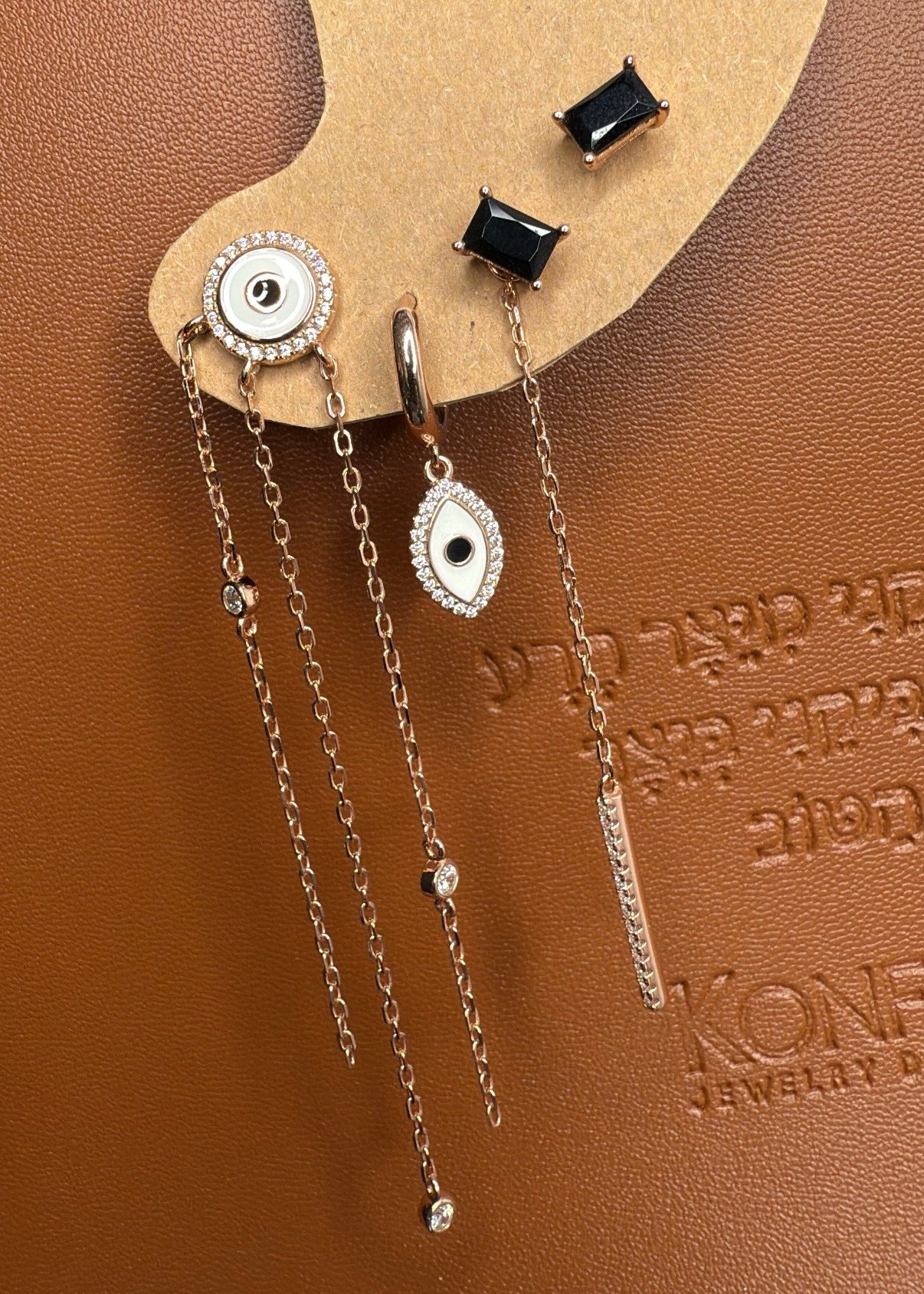 עגיל חישוק עין לבנה, עגיל עין צמודה ושרשראות נופלות, זוג אבן שחורה ושרשרת. סהכ 4 עגילים.