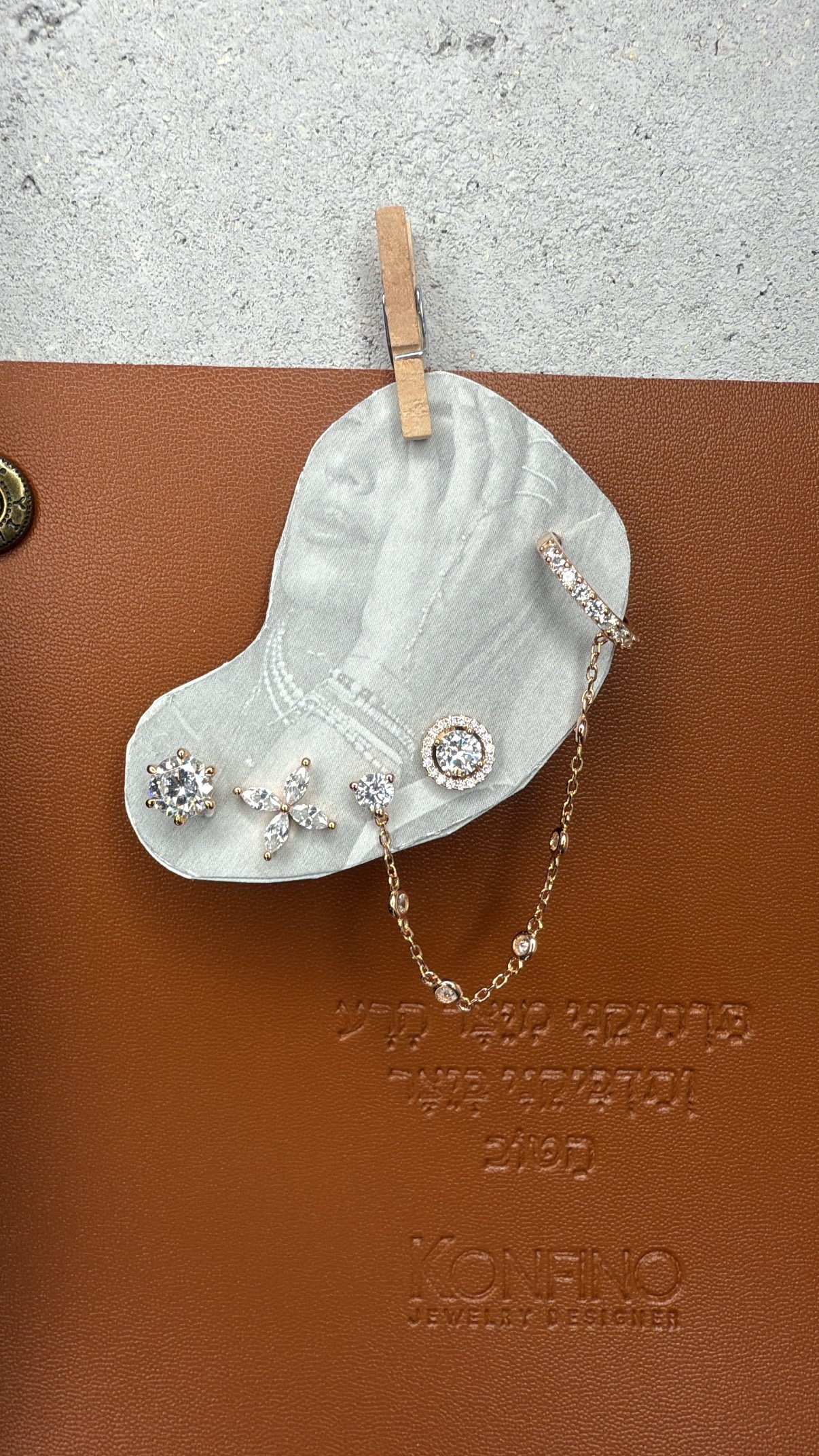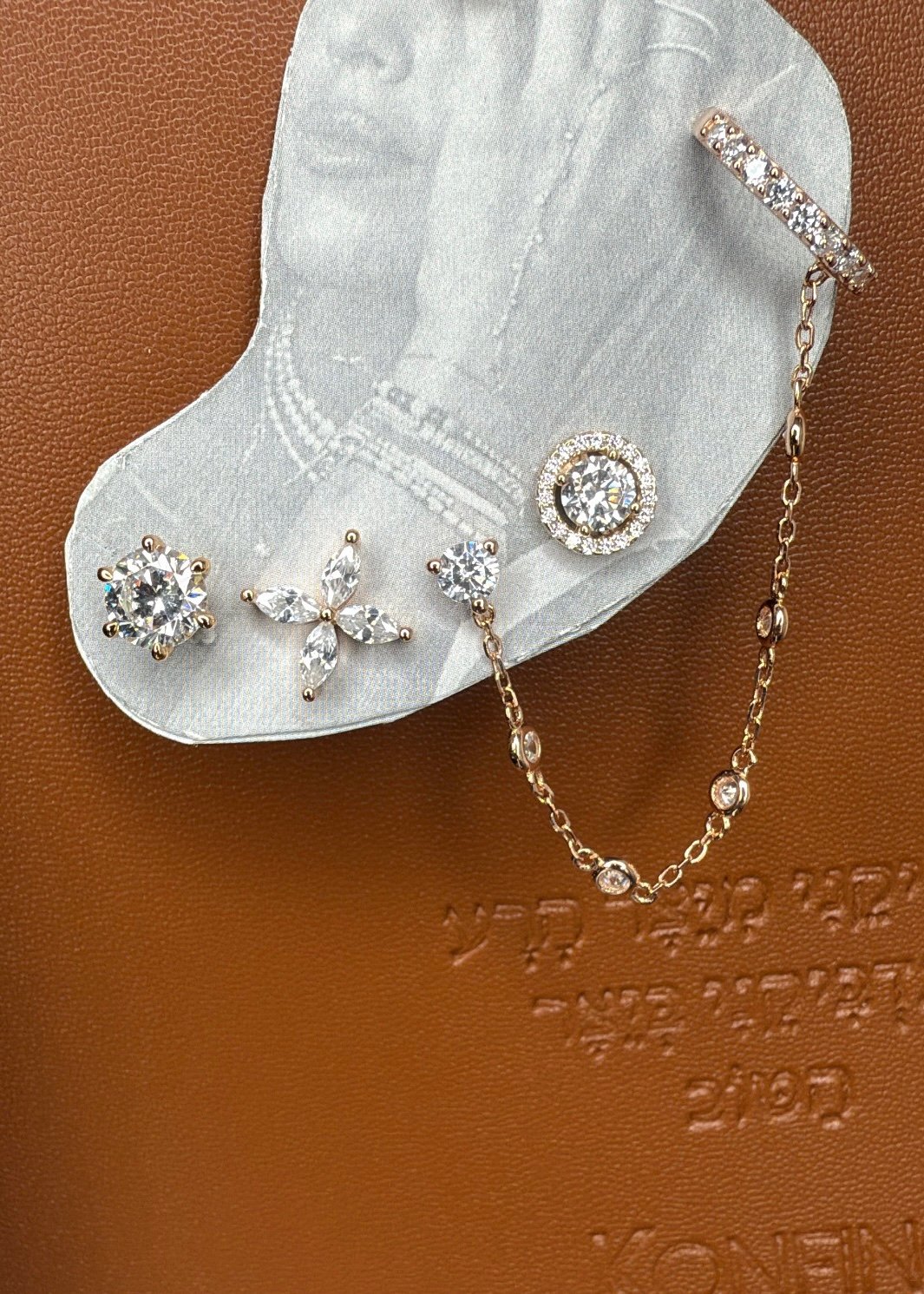 עגיל זרקון עם שרשרת והליקס, עגיל זרקון צמוד, פרח צמוד, עגיל זרקון עגול צמוד. סהכ 4 עגילים.
