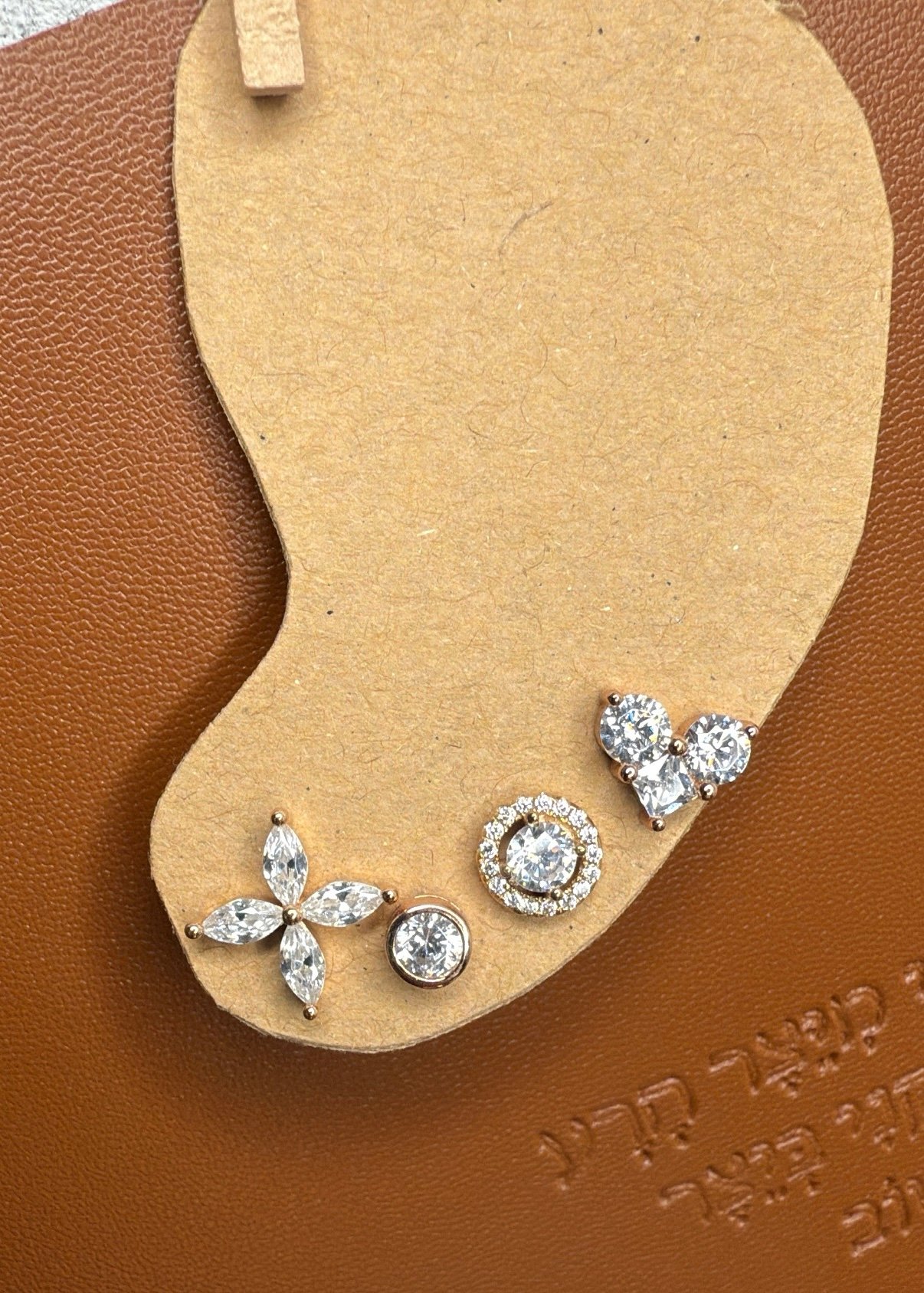 עגיל לב, עגיל זרקון עגול, עגיל פרח, עגיל עיגול שיבוץ. סהכ 4 עגילים.