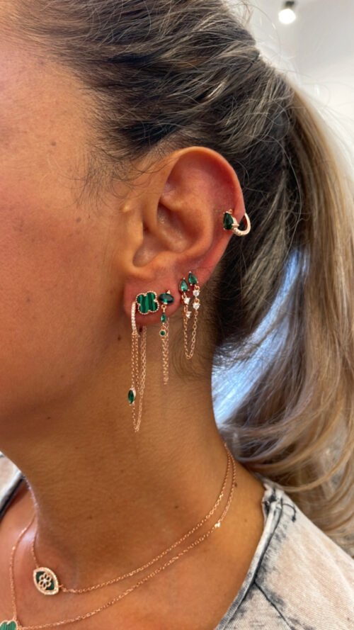 עגילי זרקונים כחולים עם שרשרת נופלת, מכסף טהור 925 בציפוי רוז גולד, משובץ זרקונים.