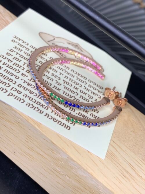 עגילי חישוק בינוני צבעוני מכסף טהור 925 / בציפוי רוז גולד. משובץ זרקונים.