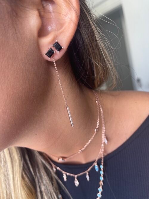 עגילי מלבן שחור עם פס נופל, מכסף טהור 925 בציפוי רוז גולד, משובצות זרקונים.