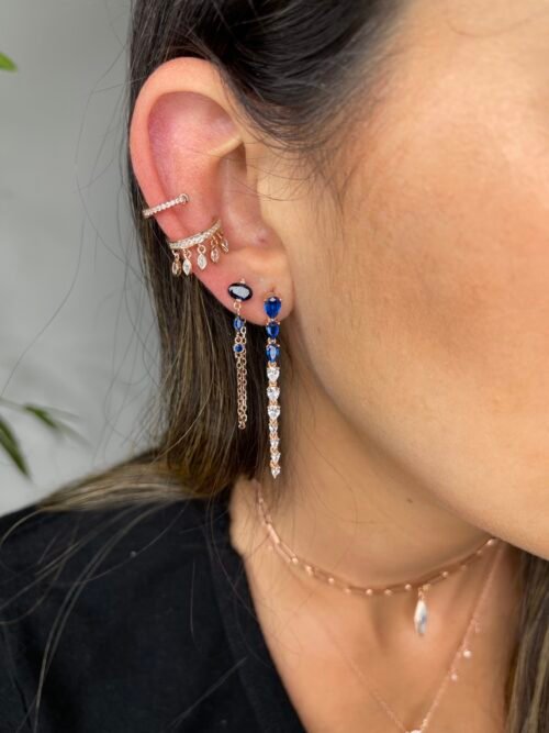 עגיל בודד ארוך טיפות זרקונים כחולים ושקופים, מכסף טהור 925 בציפוי רוז גולד. משובץ זרקונים.