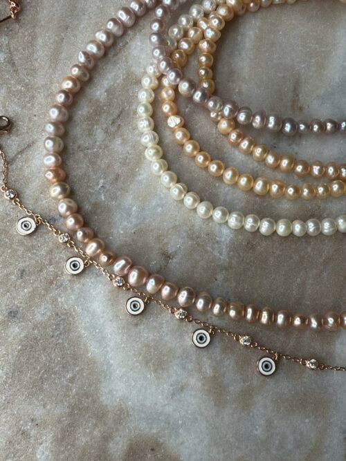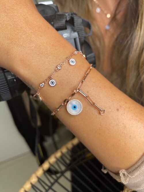 צמיד זרקונים ועיניים לבנות נופלות מכסף טהור 925, בציפוי רוז גולד. משובץ זרקונים.