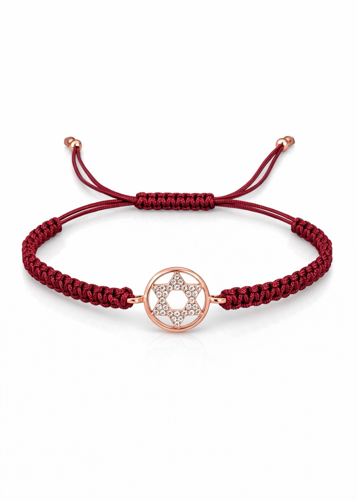 צמיד חוט בורדו רקום עם מגן דוד משובץ מכסף טהור 925, בציפוי רוז גולד. משובץ זרקונים.