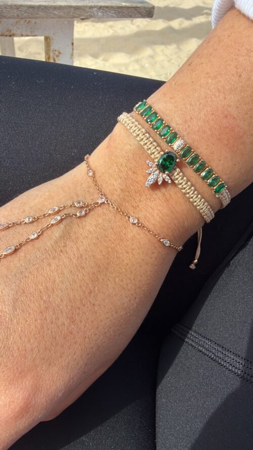צמיד חוט טבעי רקום עם לוטוס אמרלד ירוק מכסף טהור 925, בציפוי רוז גולד. משובץ זרקונים.