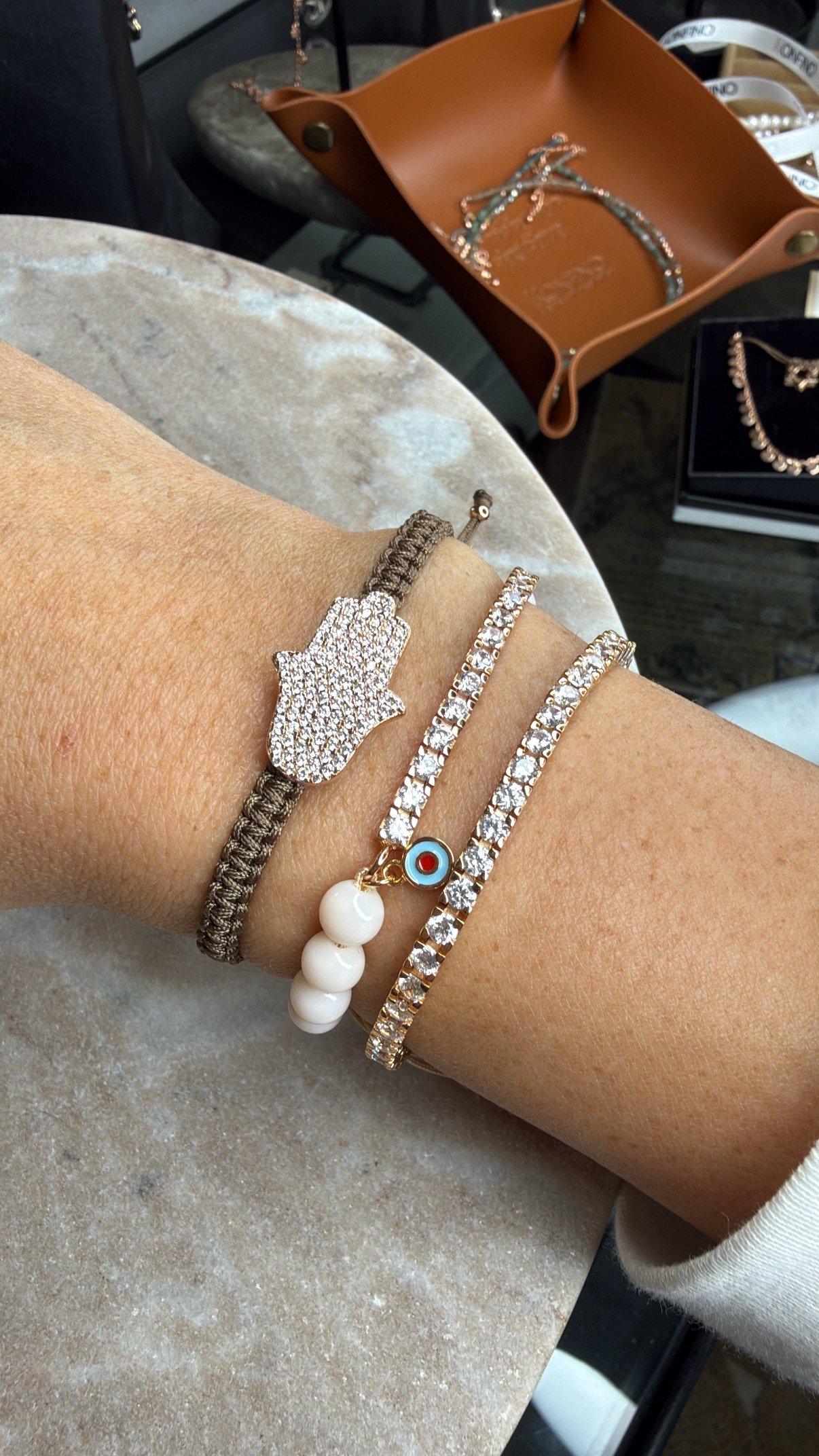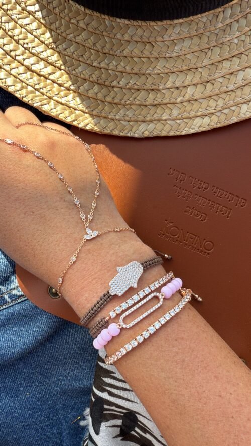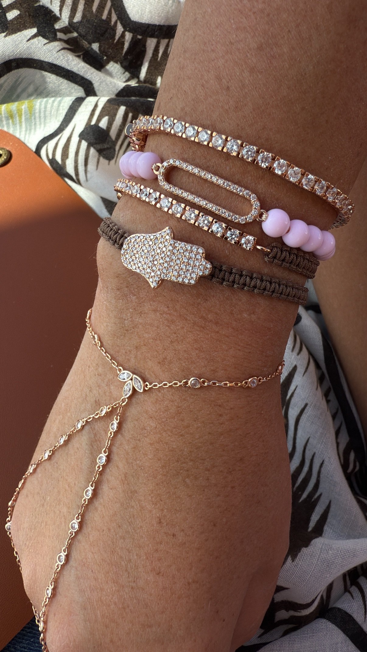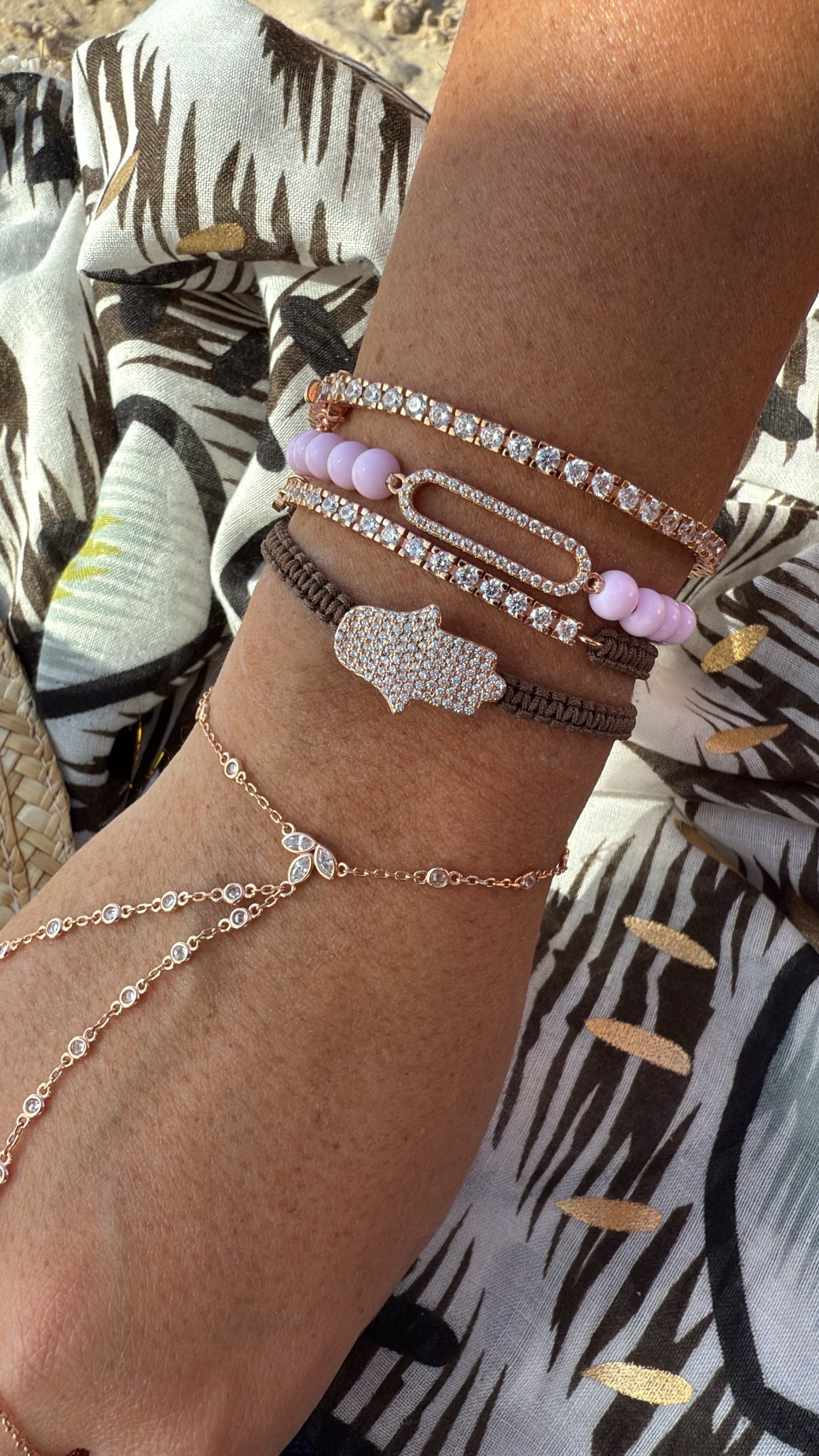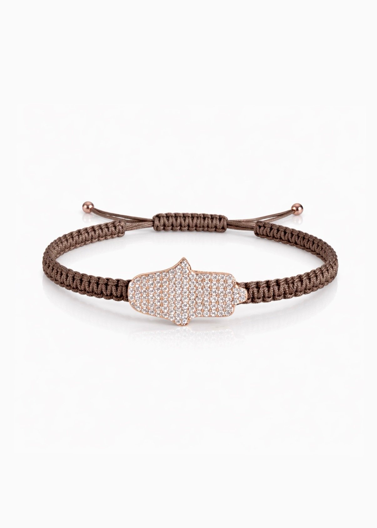 צמיד חוט חום רקום בשילוב חמסה מכסף טהור 925, בציפוי רוז גולד. משובץ זרקונים.