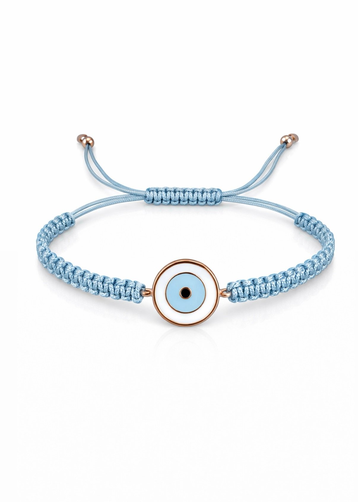 צמיד חוט תכלת רקום עם עין עגולה מכסף טהור 925, בציפוי רוז גולד. משובץ זרקונים.