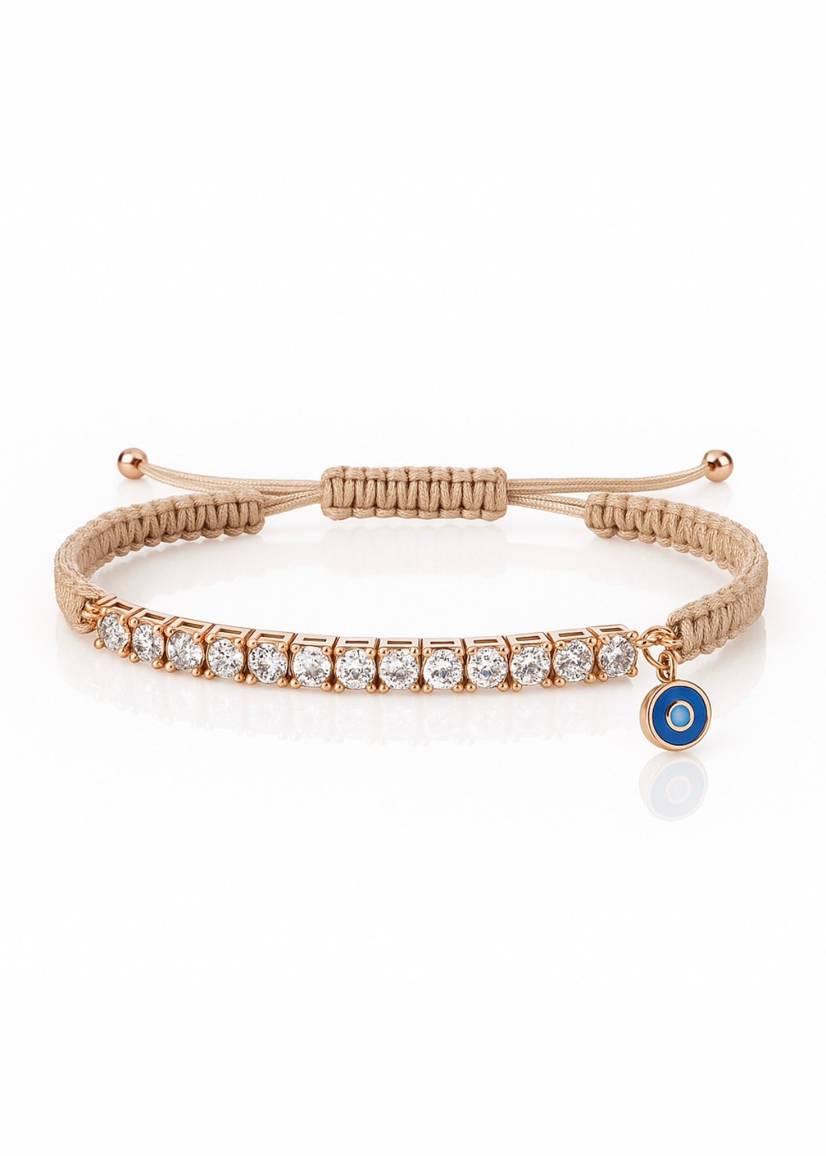 צמיד חוט טבעי רקום עם טניס ועין נופלת מכסף טהור 925, בציפוי רוז גולד. משובץ זרקונים.