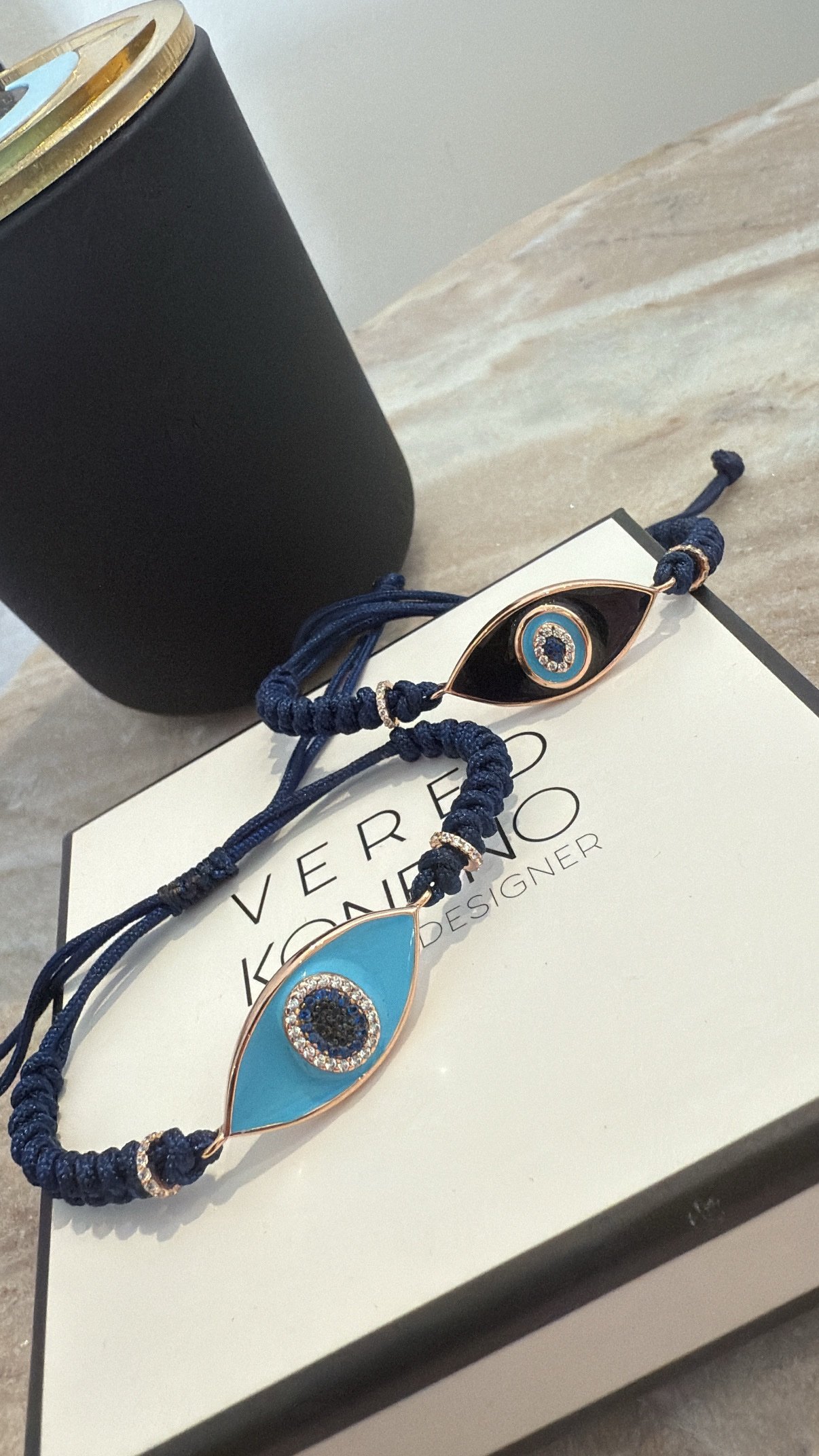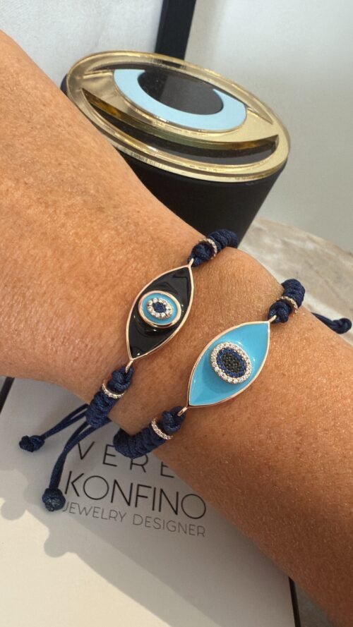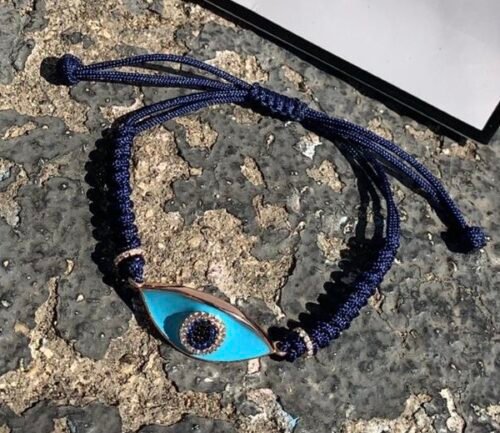 צמיד חוט כחול עם עין אמייל טורקיז מכסף טהור 925 בציפוי רוז גולד. משובץ זרקונים. אורך הצמיד סטנדרטי. נפתח ונסגר מאחור ומתאים לכל יד.