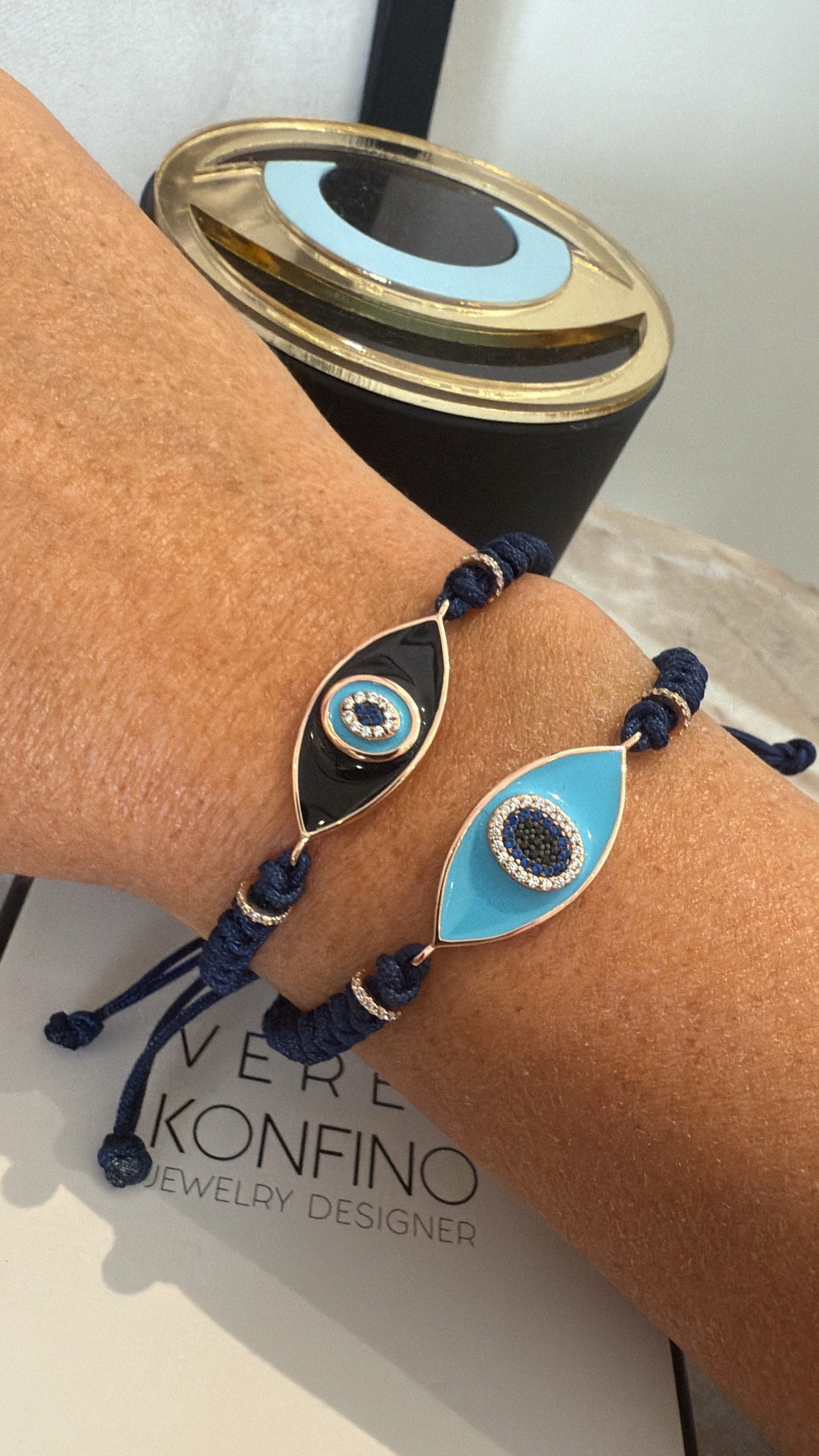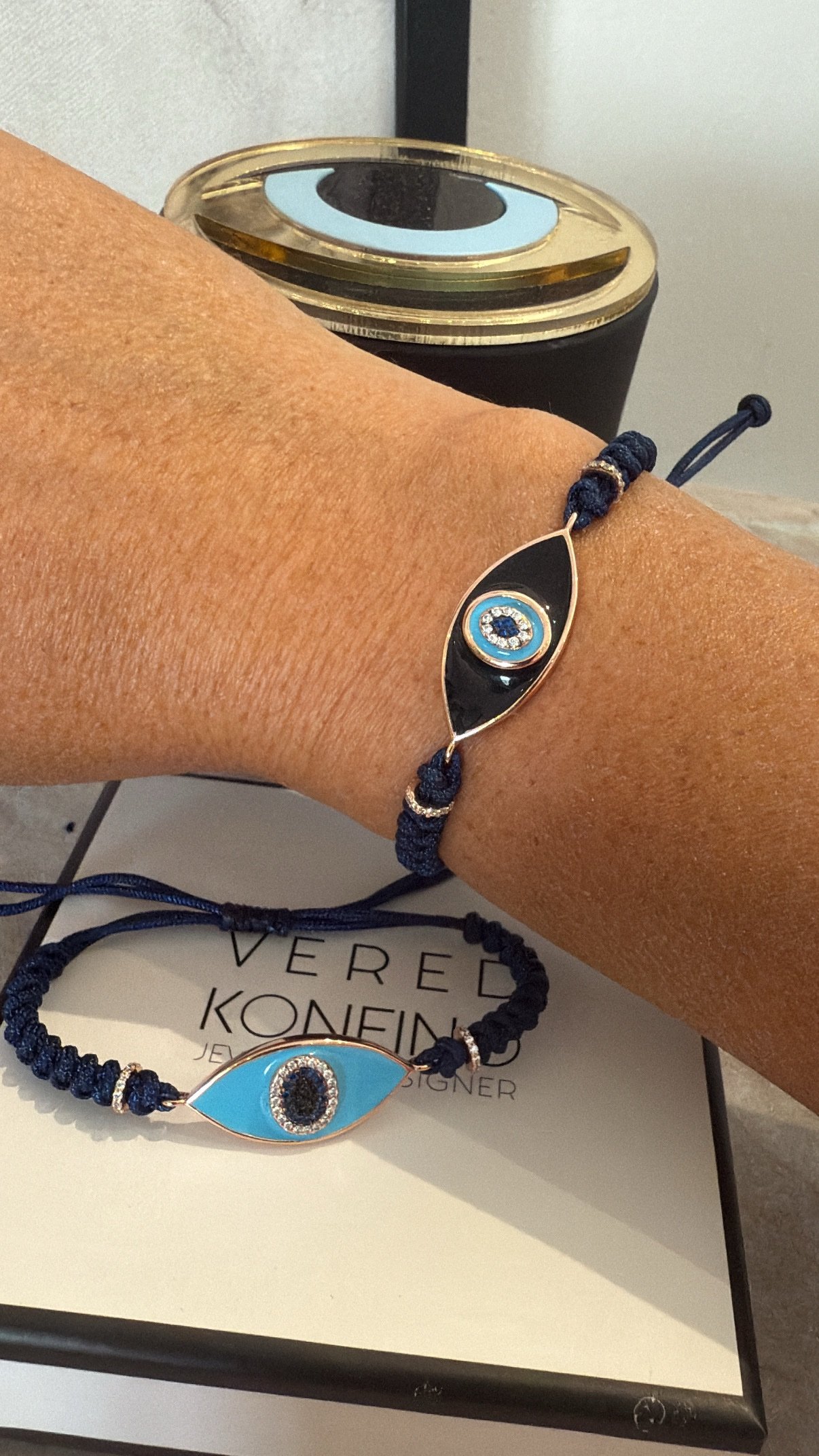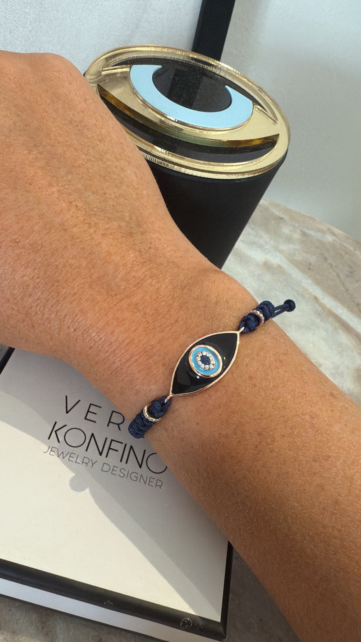 צמיד חוט כחול עם עין אמייל שחור. מכסף טהור 925 בציפוי רוז גולד. משובץ זרקונים. אורך הצמיד סטנדרטי. נפתח ונסגר מאחור ומתאים לכל יד.