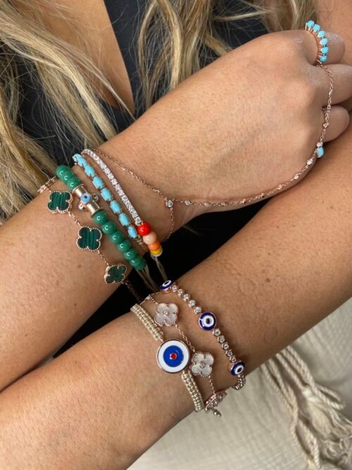 צמיד חוט קאמל עם עין עגולה אמייל בצבע לבן, כחול ואדום מכסף טהור 925, בציפוי רוז גולד. משובץ זרקונים.