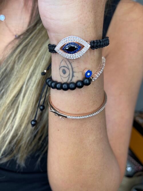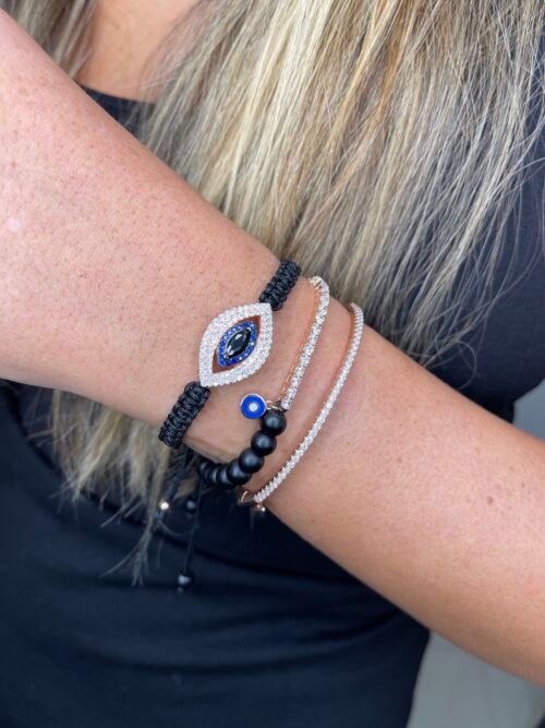 צמיד חוט שחור עם עין כחולה חלולה מכסף טהור 925, בציפוי רוז גולד. משובץ זרקונים.
