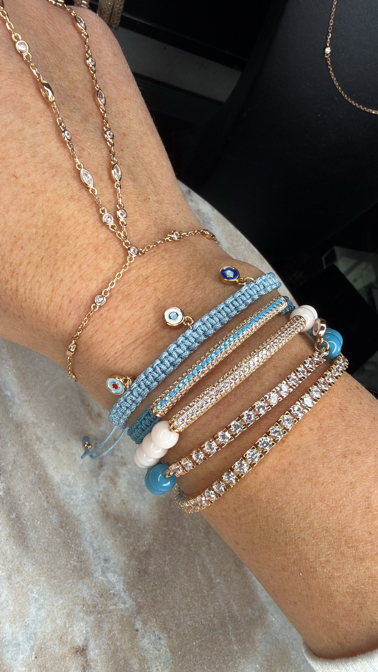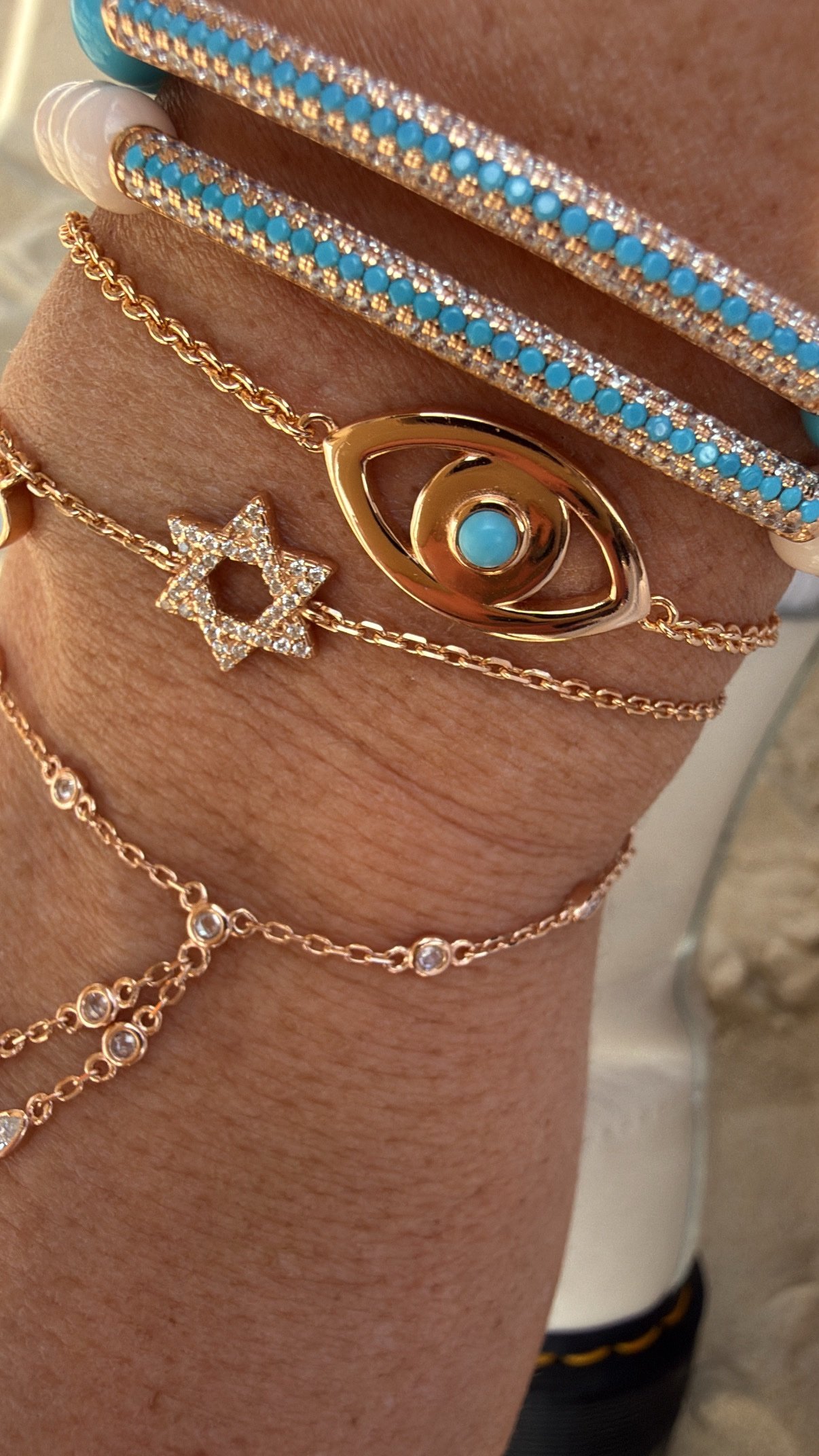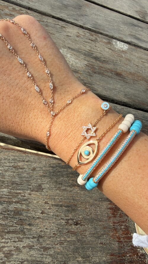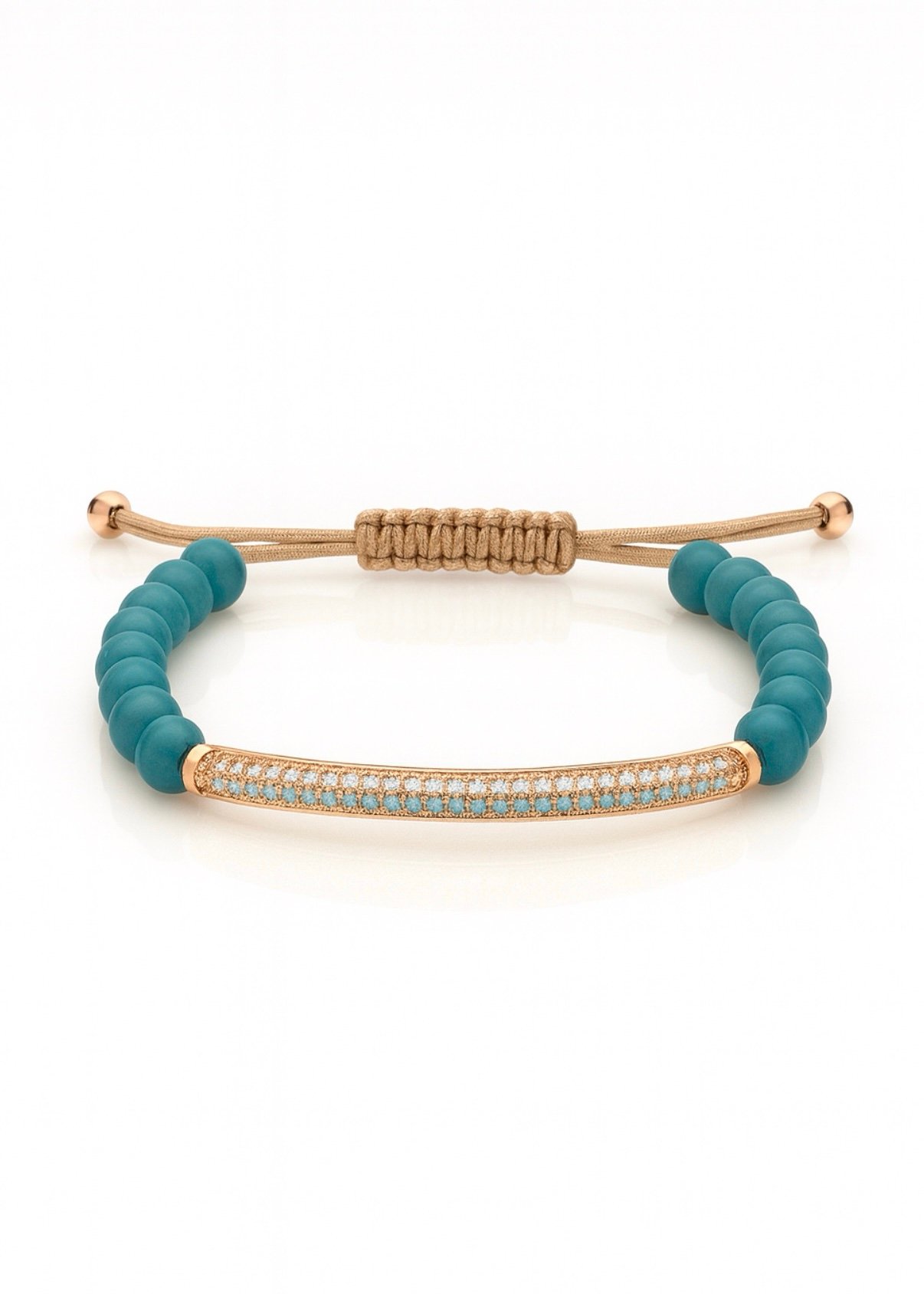 צמיד חרוזים כחולים עם פלטה משובצת מכסף טהור 925, בציפוי רוז גולד, משובץ זרקונים. ופס זרקונים טורקיז.