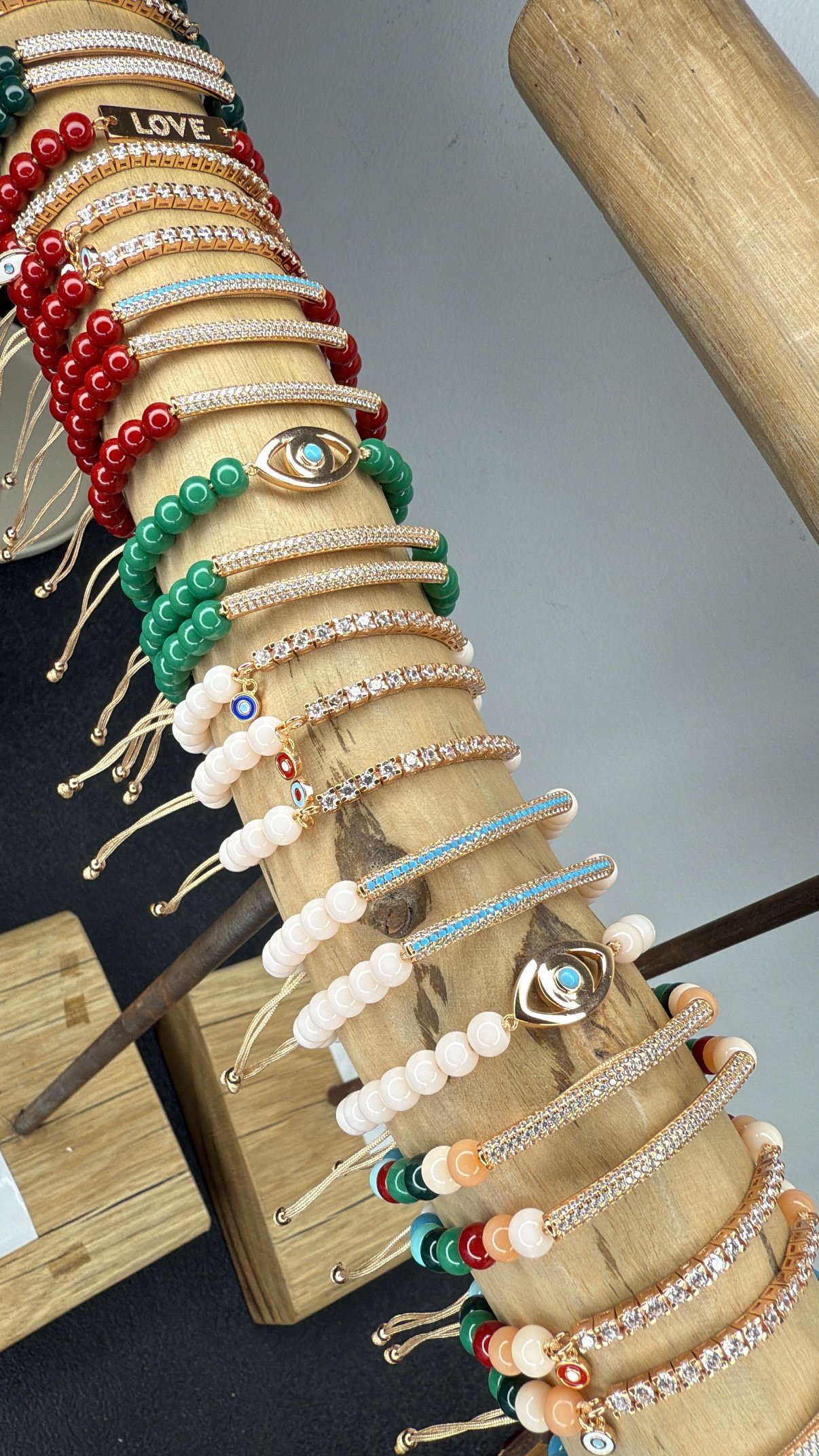 אורך הצמיד סטנדרטי ומתאים לכל יד. נפתח ונסגר עם חוט רקום, ושני חרוזים נופלים.