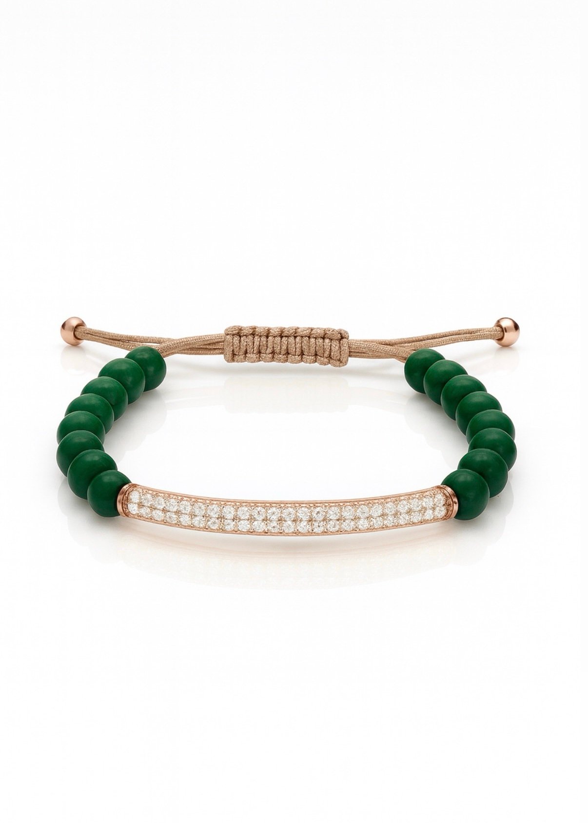 צמיד חרוזים ירוקים עם פלטה משובצת מכסף טהור 925, בציפוי רוז גולד, משובץ זרקונים.