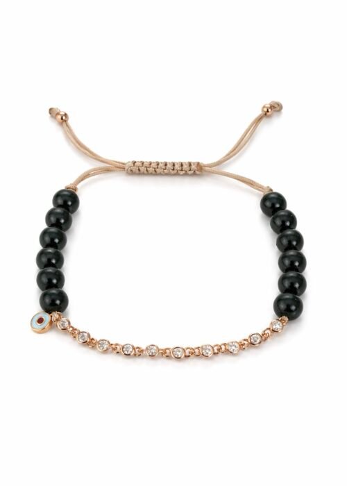 צמיד חרוזים ירוק כהה בשילוב פס זרקונים ועין נופלת מכסף טהור 925, בציפוי רוז גולד, משובץ זרקונים.