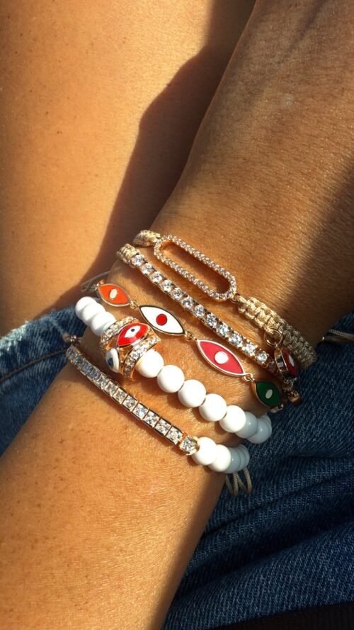 צמיד חרוזים לבנים עם חרוז עיניים צבעוניות משובץ