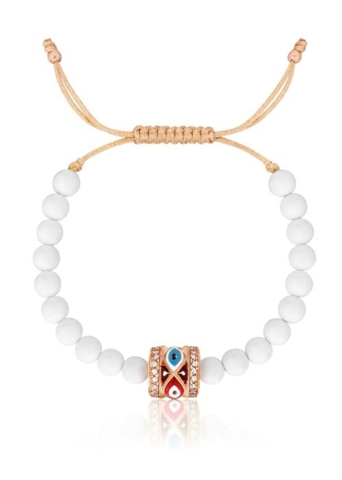 צמיד חרוזים לבנים עם חרוז עין צבעונית מכסף טהור 925, בציפוי רוז גולד, משובץ זרקונים.