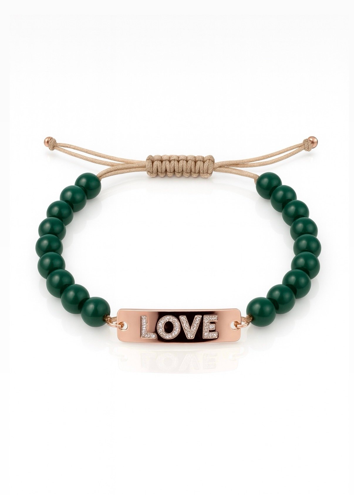 צמיד חרוזים ירוק כהה עם פלטה LOVE מכסף טהור 925, בציפוי רוז גולד, משובץ זרקונים.