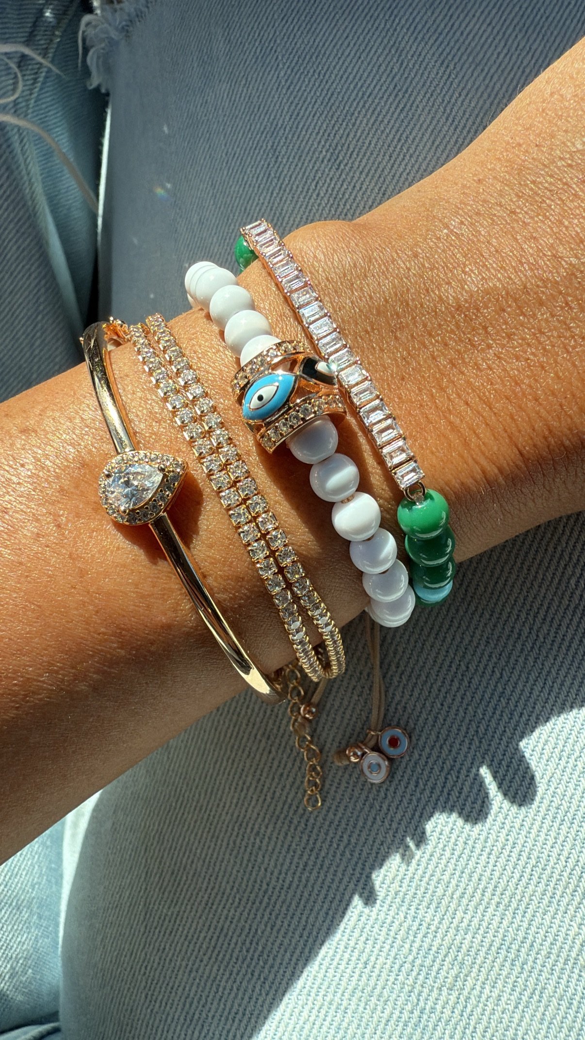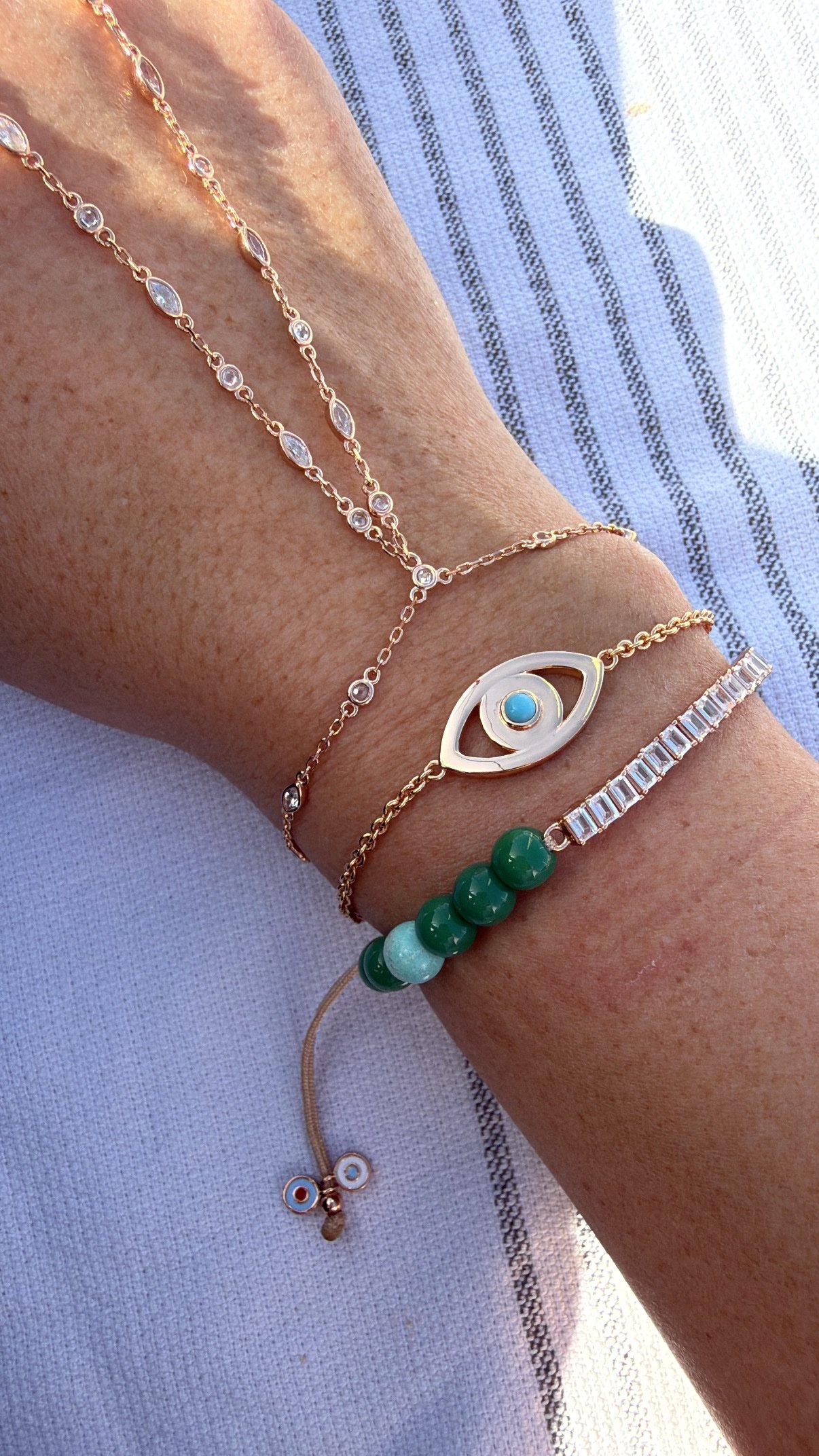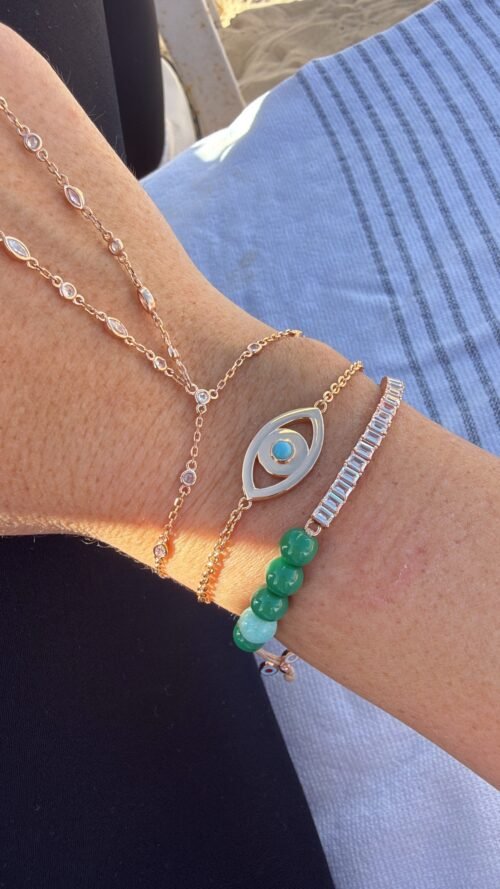 צמיד חרוזים שילוב ירוק וטורקיז עם טניס בגטים ועין נופלת