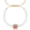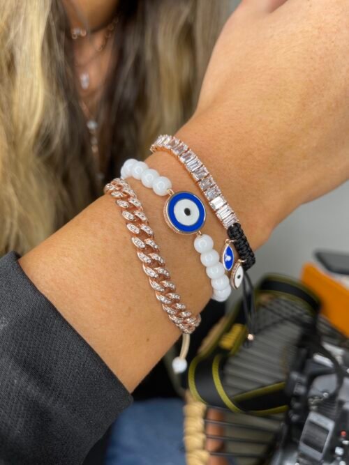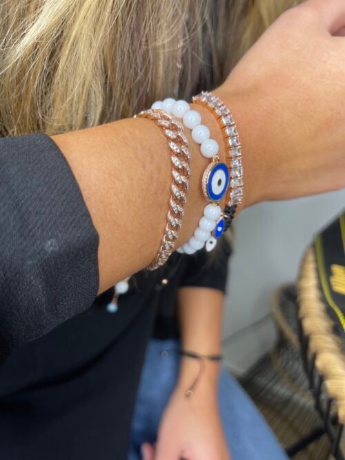 צמיד חרוזים לבנים עם עין כחולה עגולה מכסף טהור 925 בציפוי רוז גולד, משובצת זרקונים.