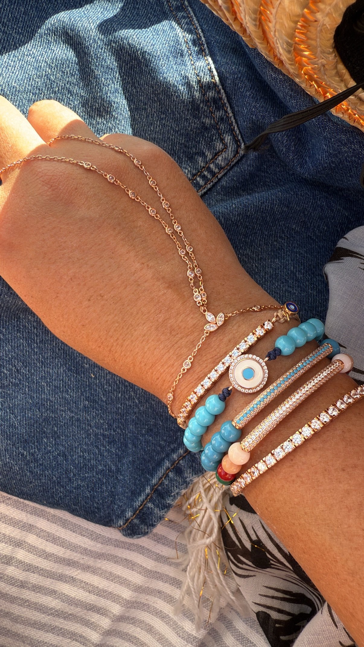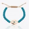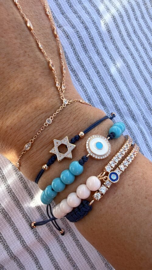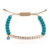 צמיד חרוזים תכלת עם עין אמייל עגולה מכסף טהור 925 בציפוי רוז גולד, בשיבוץ זרקונים.
