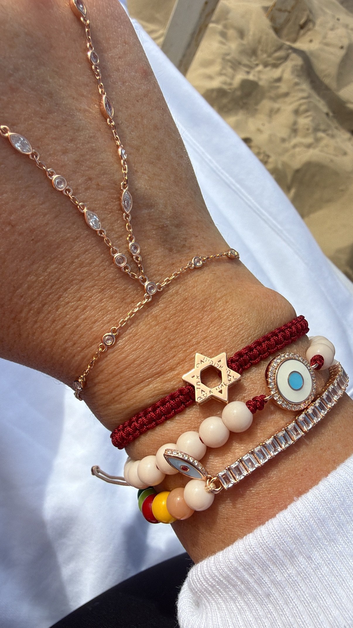 צמיד חרוזים ניוד עם עין אמייל עגולה מכסף טהור 925 בציפוי רוז גולד, בשיבוץ זרקונים.