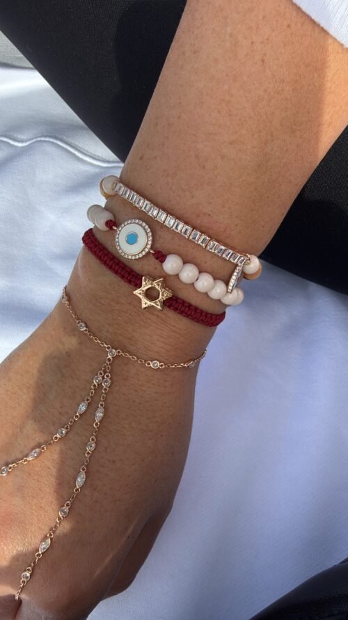 אורך הצמיד סטנדרטי, נפתח ונסגר עם חוט רקום, ושני חרוזים נופלים.