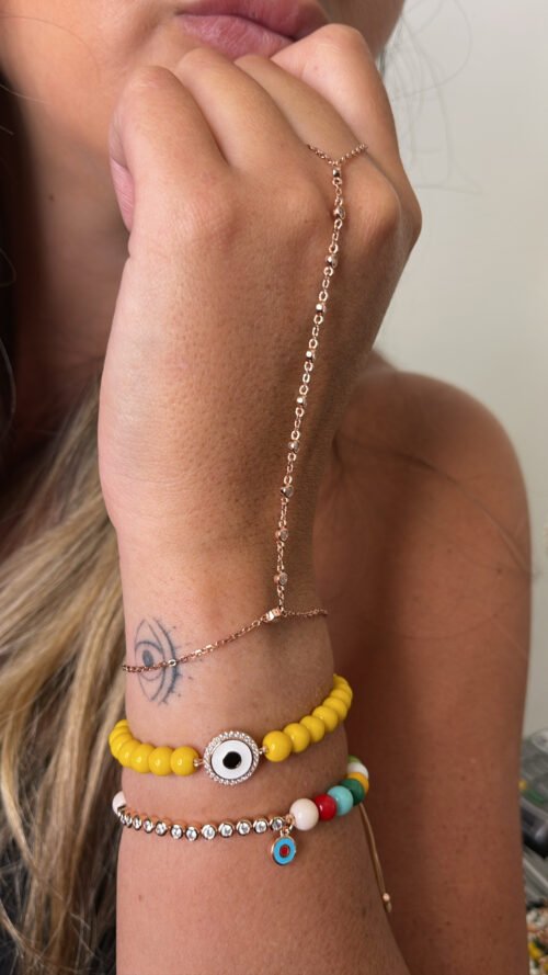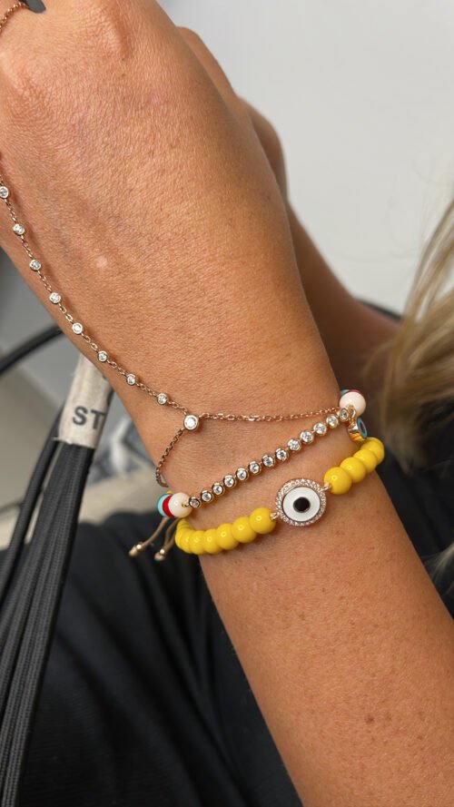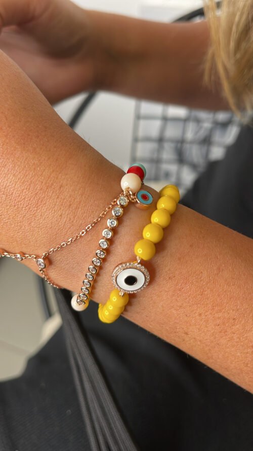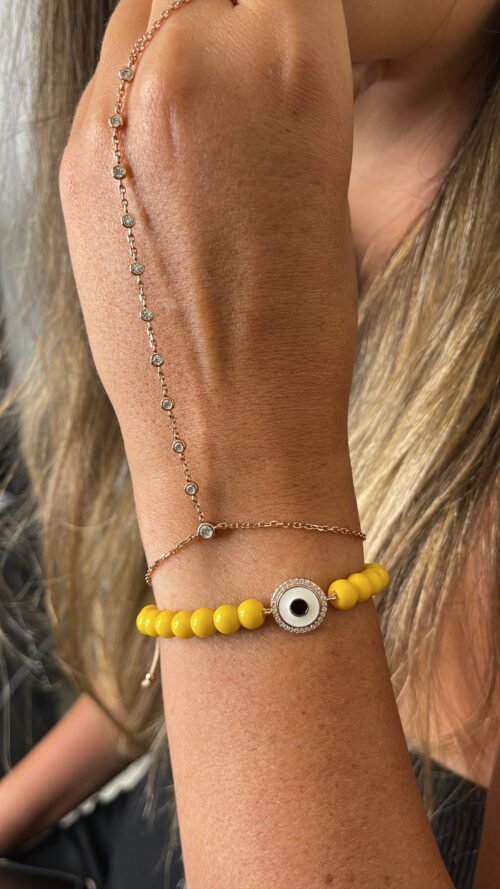 צמיד חרוזים צהובים עם עין אמייל עגולה מכסף טהור 925 בציפוי רוז גולד, משובצת זרקונים.
