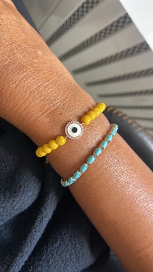 צמיד חרוזים צהובים עם עין אמייל עגולה