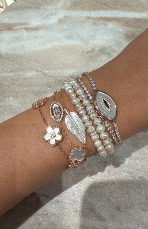 צמיד 3 תלתן פנינה בשילוב פרחים, מכסף טהור 925, בציפוי רוז גולד.