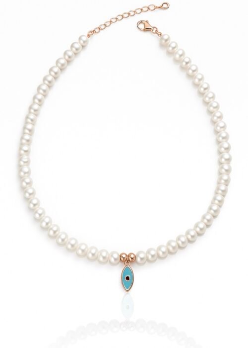 שרשרת פנינים מתורבתות בצבע לבן עם עין קטנה אמייל תכלת מכסף טהור 925 בציפוי רוז גולד, בשיבוץ זרקונים.