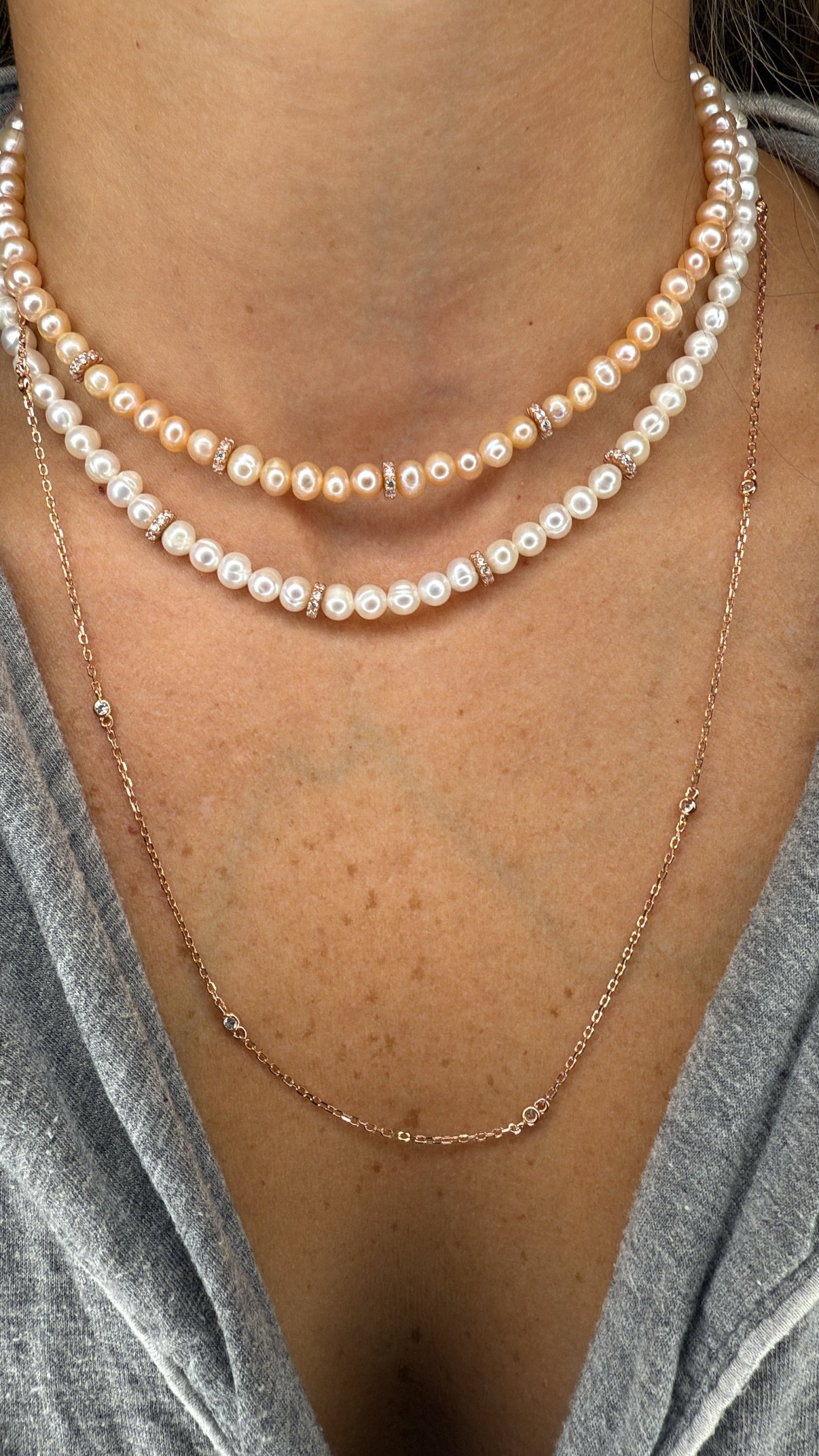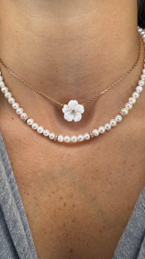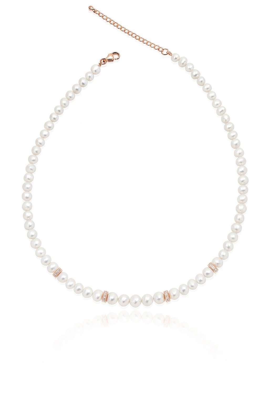שרשרת פנינים מתורבתות בצבע לבן עם רונדלים מכסף טהור 925 בציפוי רוז גולד, בשיבוץ זרקונים.