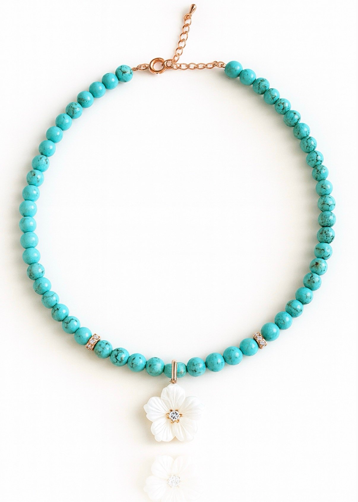 שרשרת חרוזים טורקיז בשילוב פרח פנינה