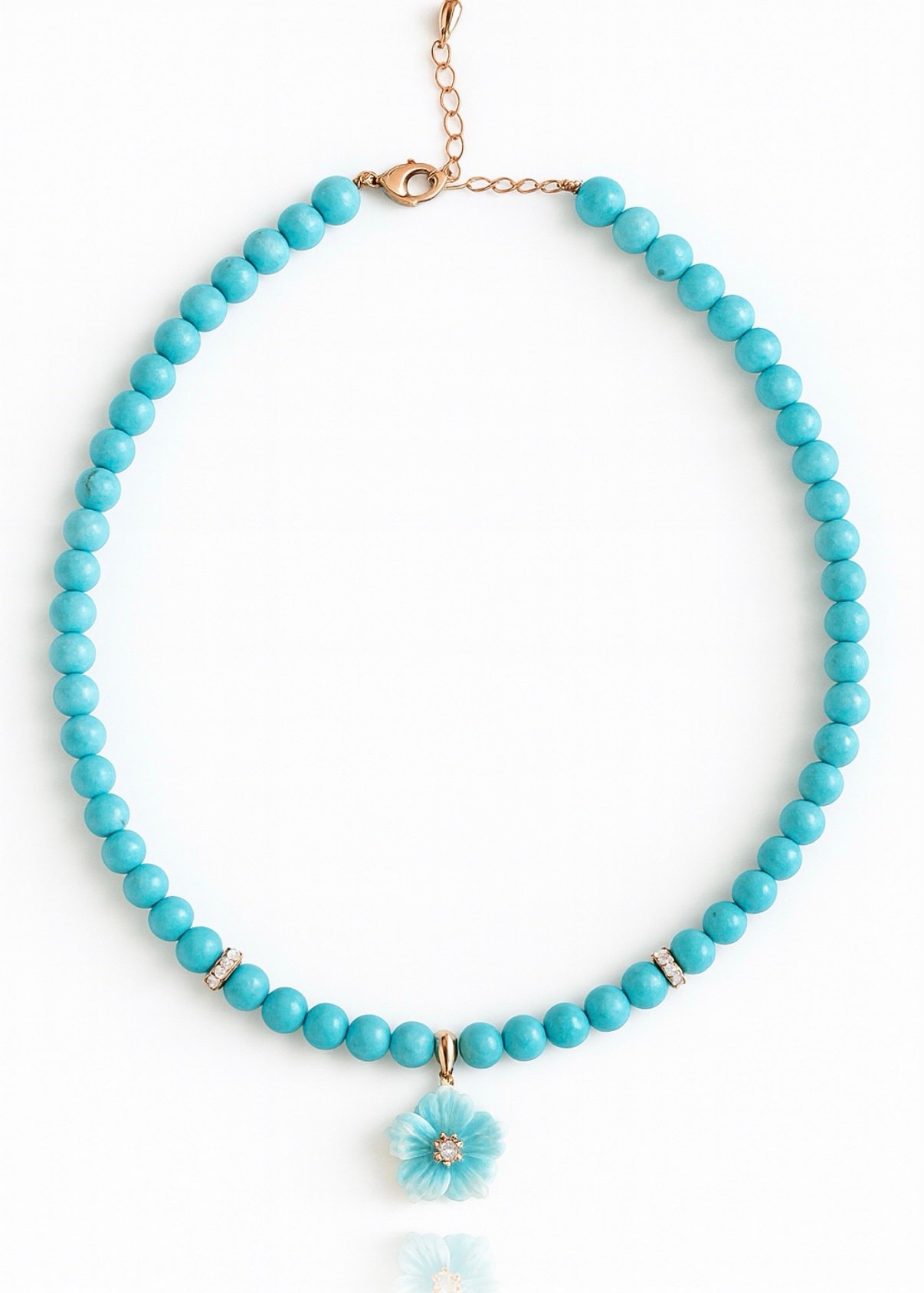 שרשרת חרוזים טורקיז בשילוב פרח פנינה תכלת