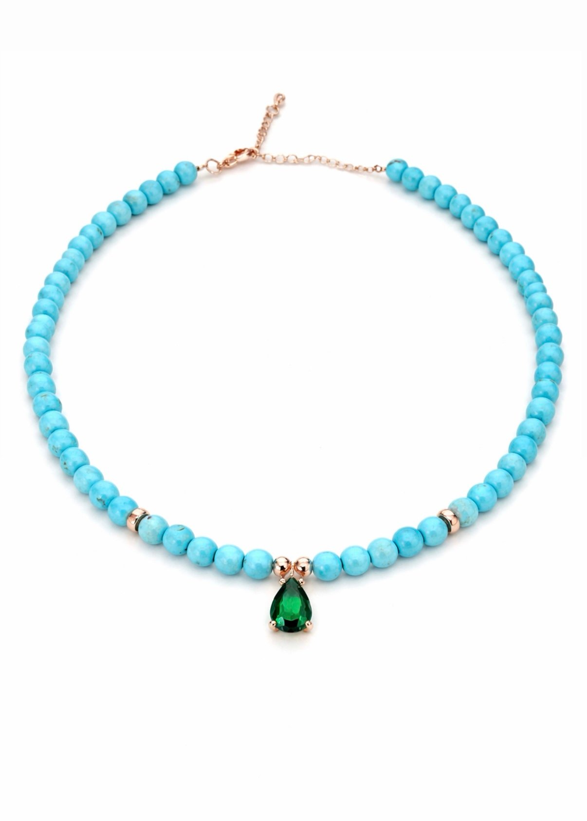 שרשרת חרוזים טורקיז בשילוב טיפה אמרלד, מכסף טהור 925 , בציפוי רוז גולד ושיבוץ זרקונים.