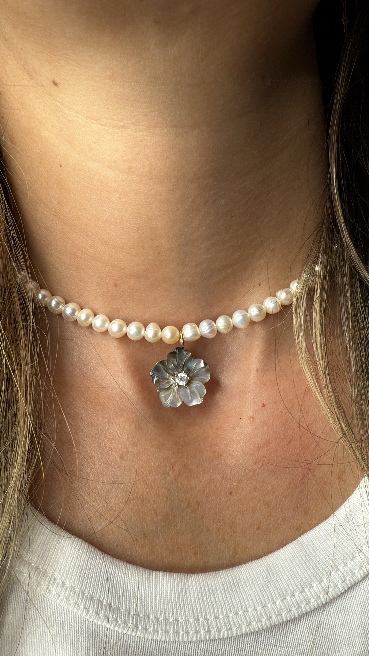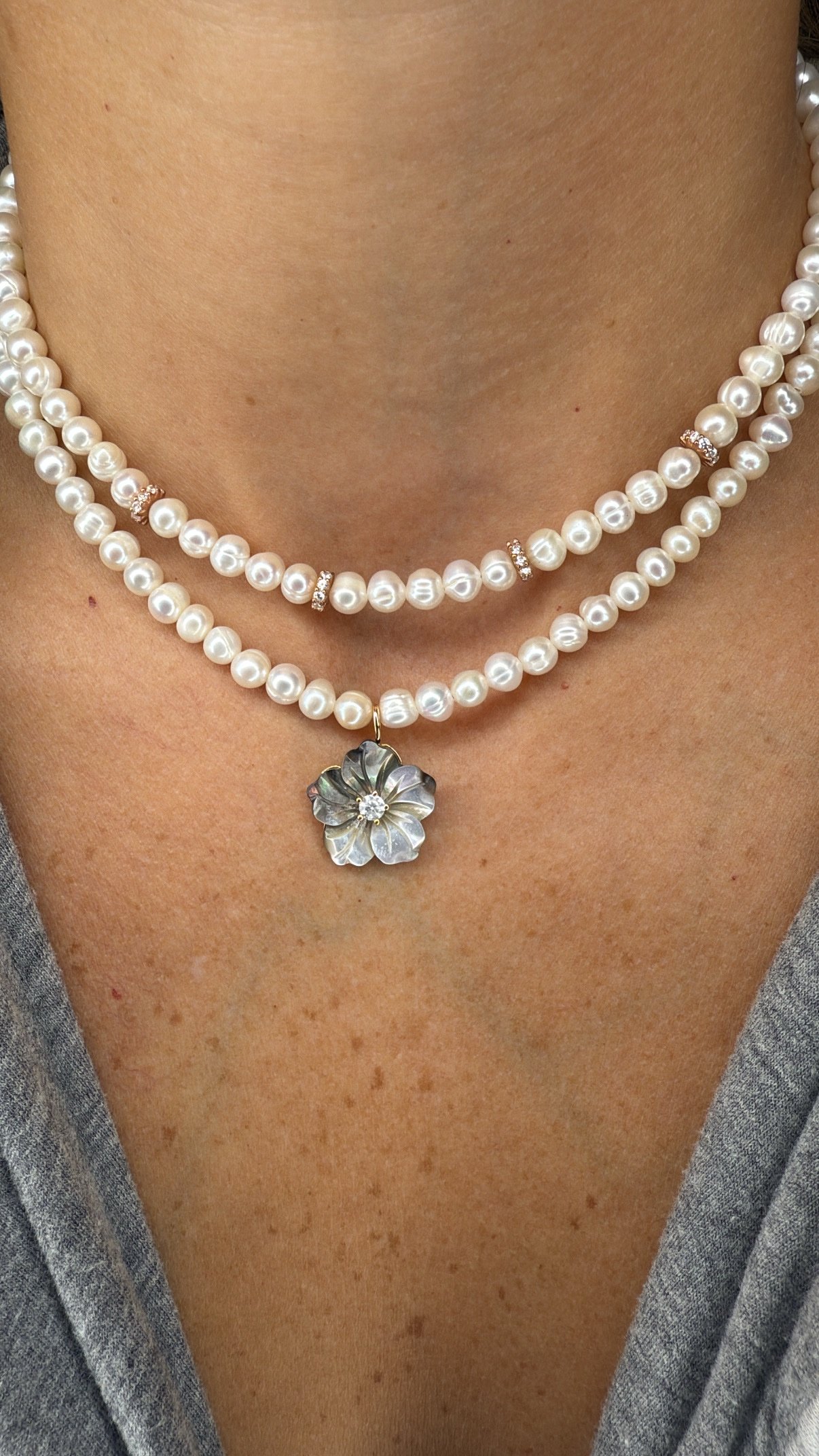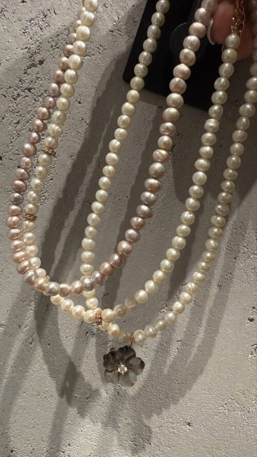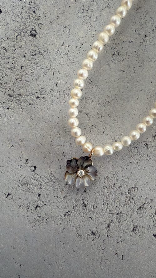 שרשרת פנינים בשילוב פרח שחור, מכסף טהור 925 , בציפוי רוז גולד ושיבוץ זרקונים.