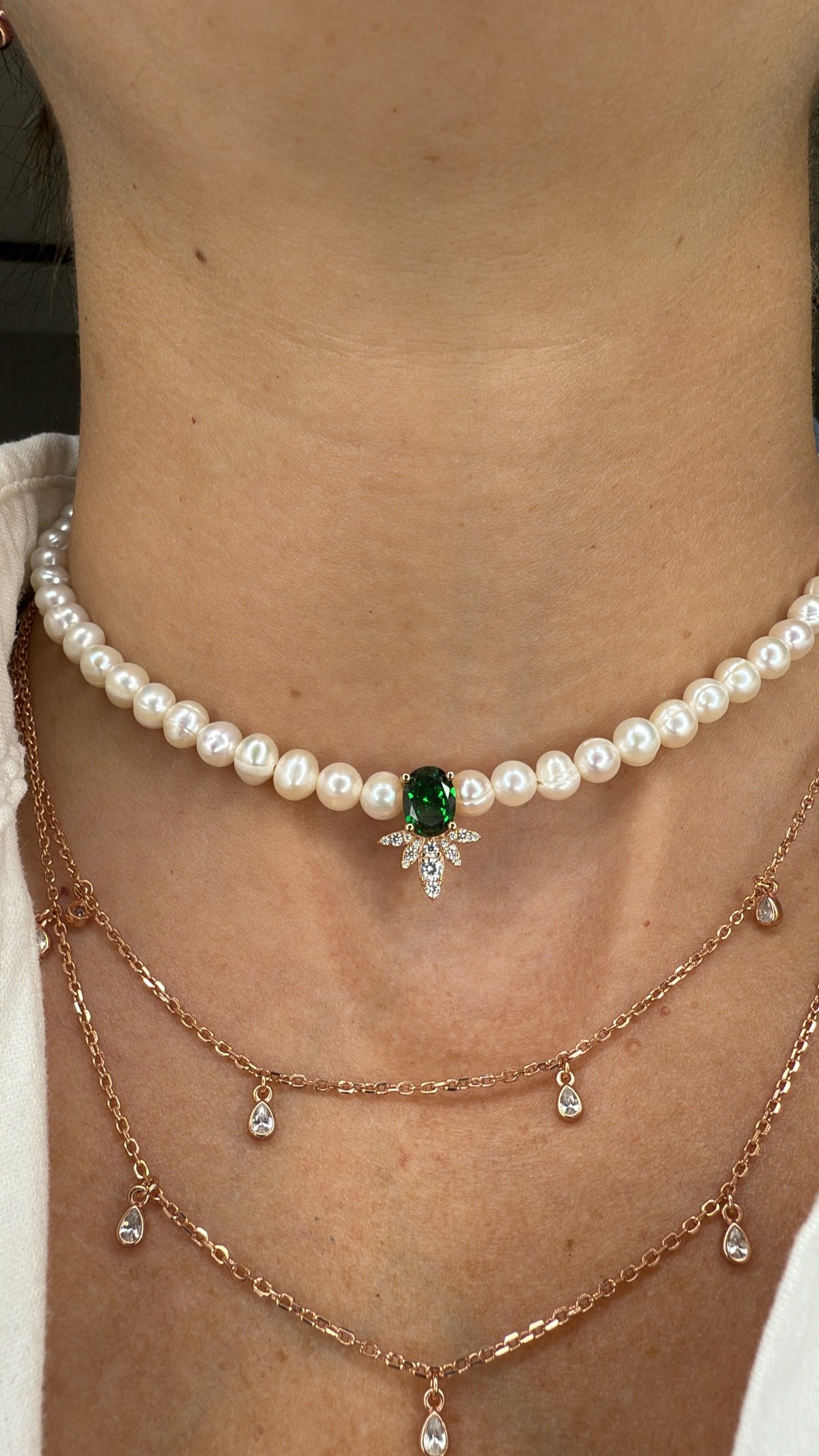 שרשרת פנינים בשילוב תליון קייט ירוק אמרלד, מכסף טהור 925 , בציפוי רוז גולד ושיבוץ זרקונים.