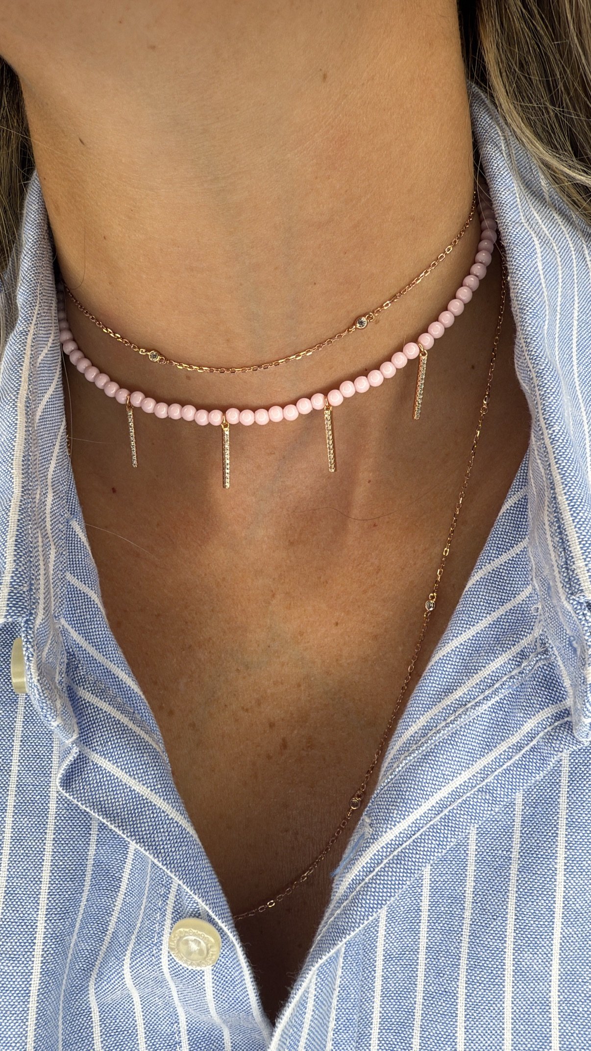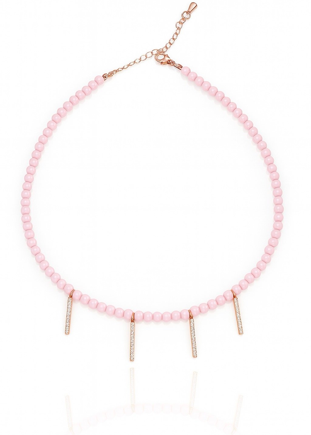 שרשרת חרוזים ורודים עם עמודים משובצים מכסף טהור 925 בציפוי רוז גולד, משובץ זרקונים.