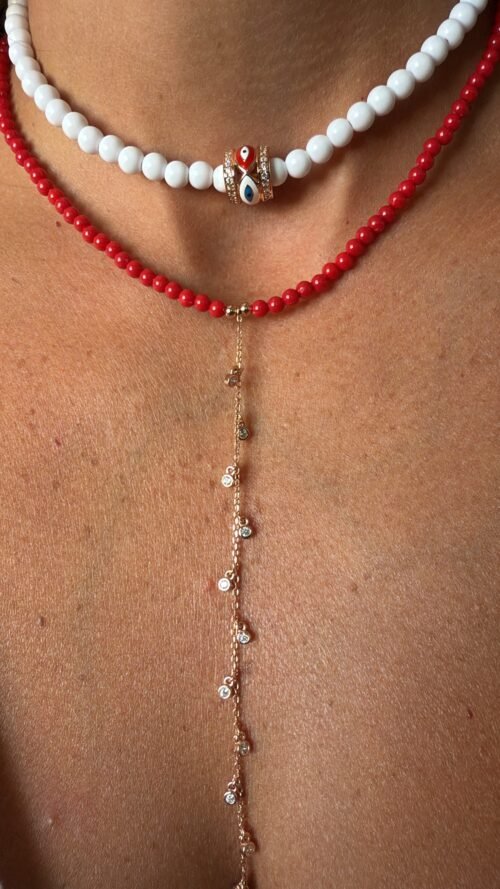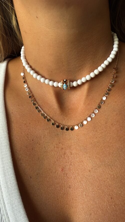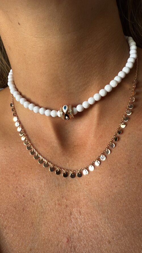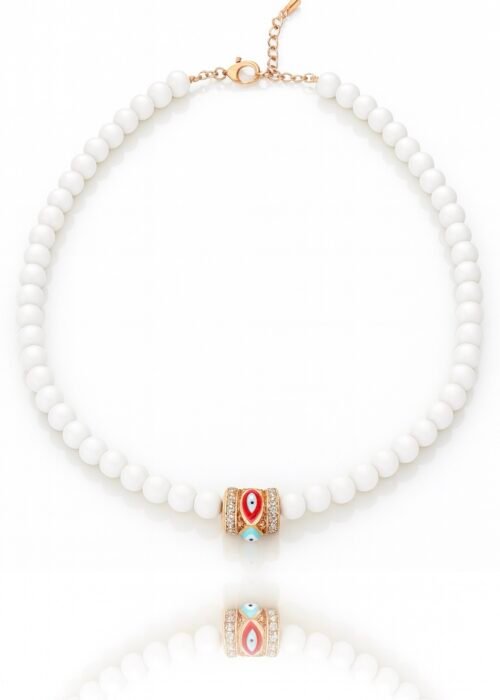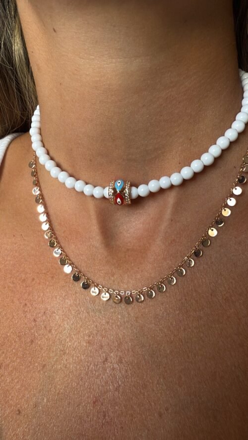 שרשרת חרוזים לבנים בשילוב חרוז עיניים צבעוניות מכסף טהור 925 בציפוי רוז גולד, משובצת זרקונים.