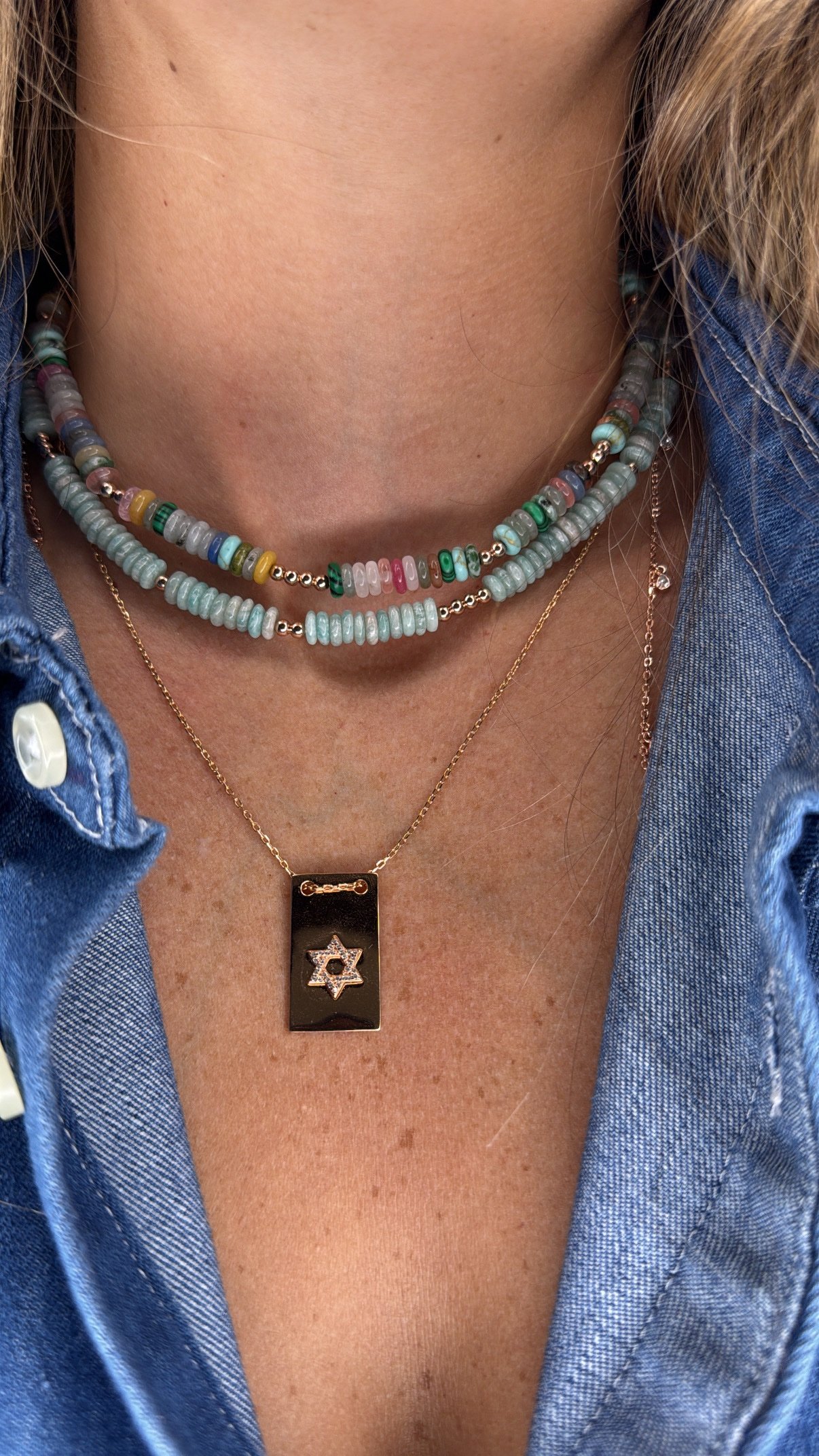 שרשרת חרוזים דיסקית תכלת בשילוב חרוזי רוז גולד.
