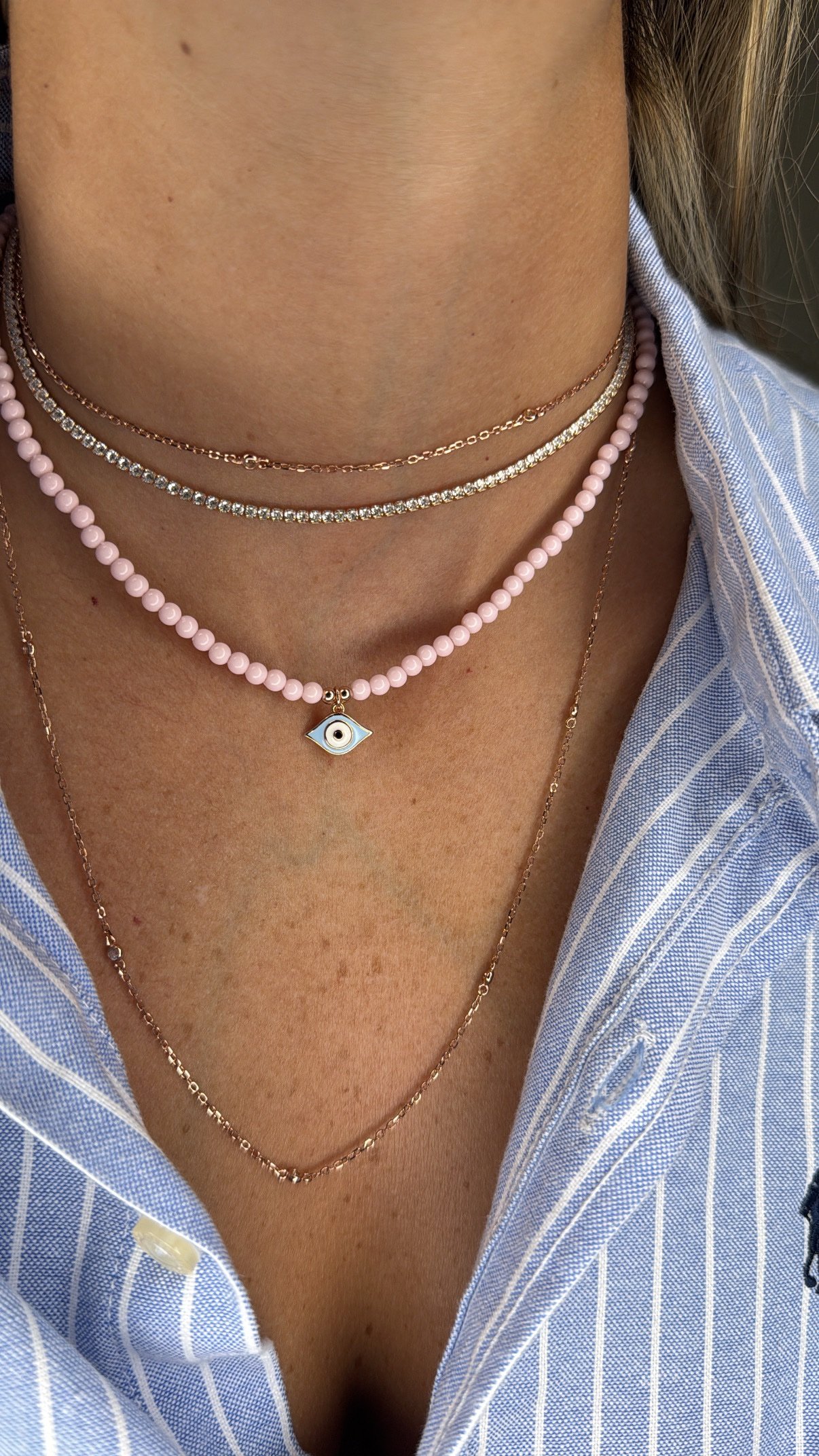 שרשרת חרוזים ורודים עם עין אמייל תכלת