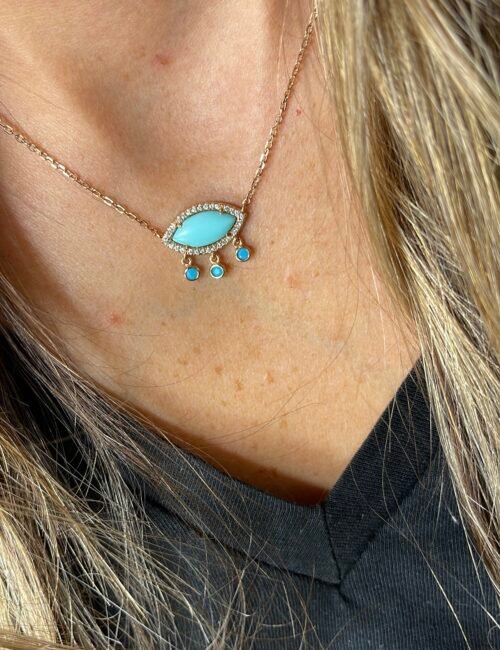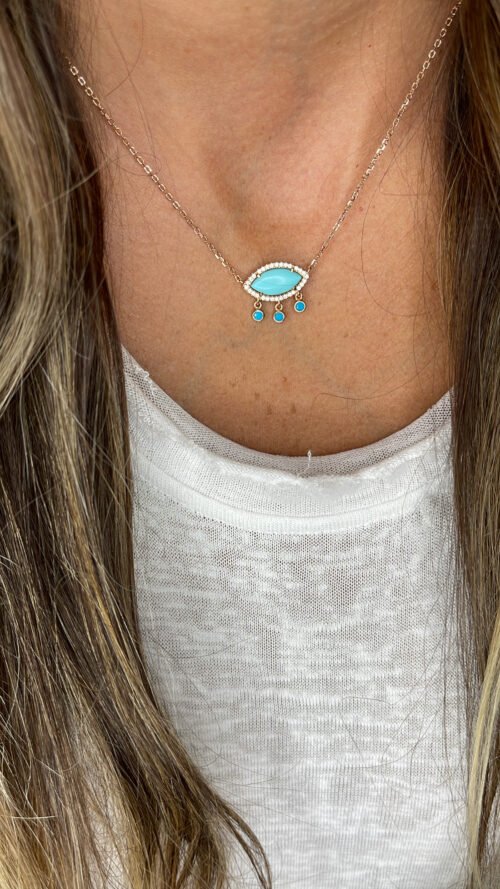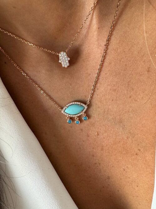 שרשרת עין טורקיז עם זרקונים טורקיז מכסף טהור 925 בציפוי רוז גולד, משובצת זרקונים.
