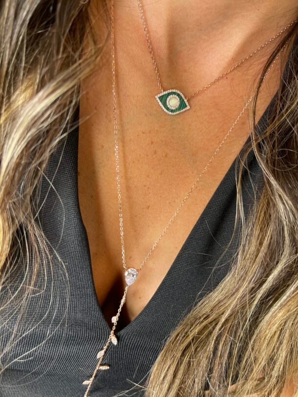 שרשרת עין בשילוב אבן מלכית ירוקה, מכסף טהור 925 בציפוי רוז גולד, משובצת זרקונים.